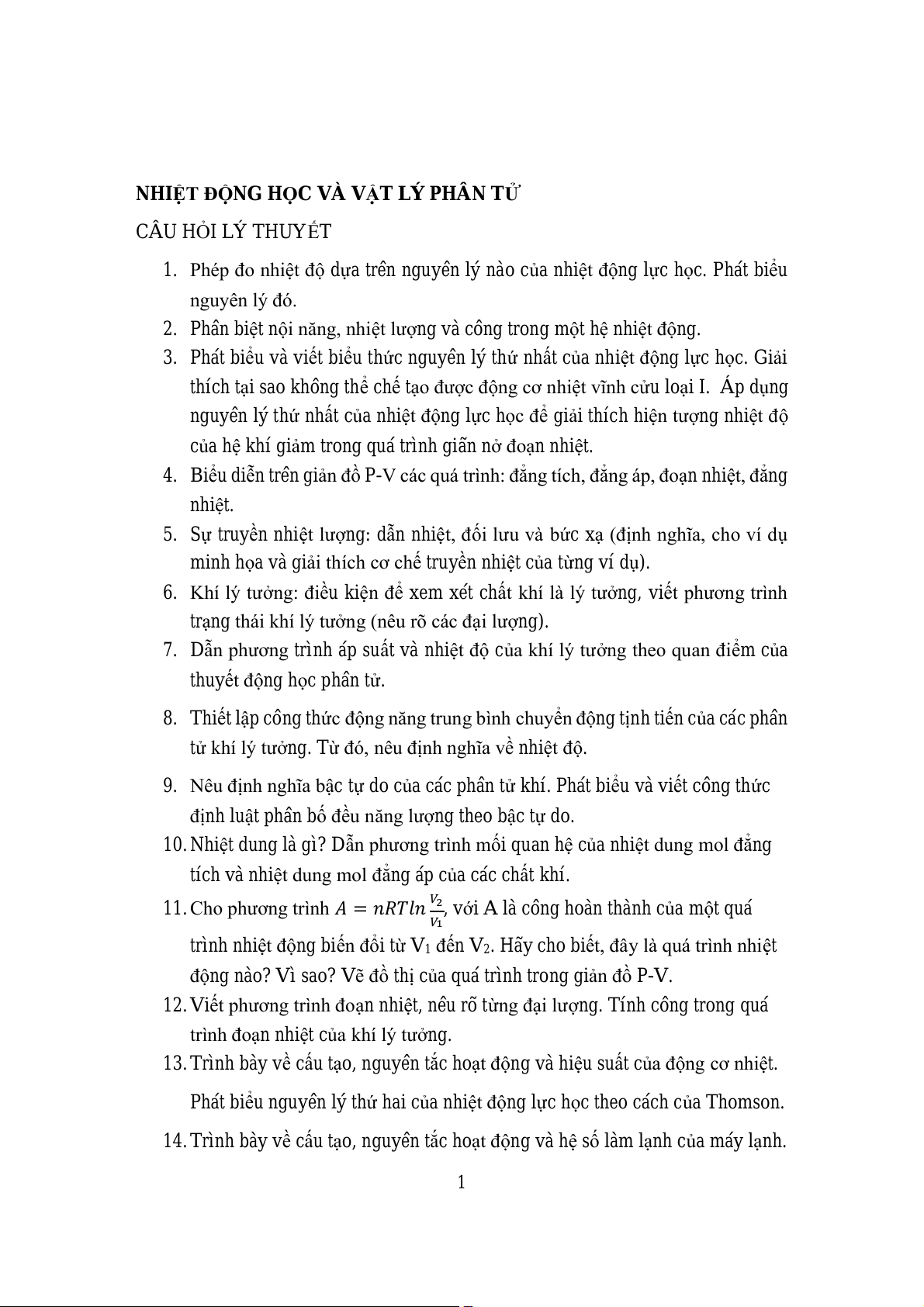 NHIỆT ĐỘNG HỌC VÀ VẬT LÝ PHÂN TỬ CÂU HỎI LÝ THUYẾT