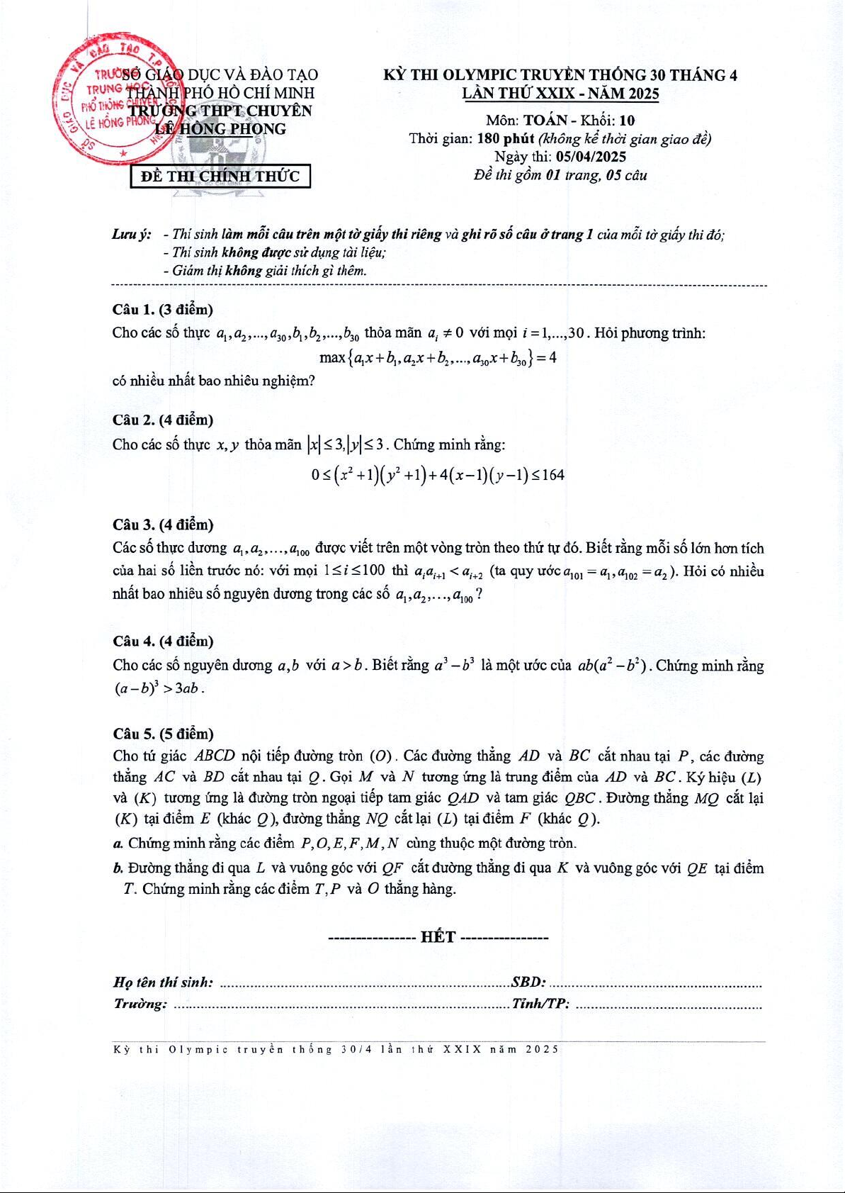 LẦN THỨ XXIX - NĂM 2025 TRƯỜNG THPT CHUYÊN LÊ HỒNG PHONG Môn: TOÁN Khối: 10