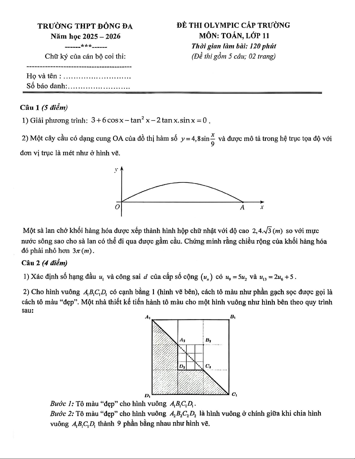 Xin giới thiệu đến quý thầy, cô giáo và các em học sinh đề thi Olympic cấp trường môn Toán 11 năm học 2025 – 2026 trường THPT Đống Đa, thành phố Hà Nội. Đề thi gồm 02 trang, hình thức tự luận với 05 bài toán, thời gian làm bài 120 phút.