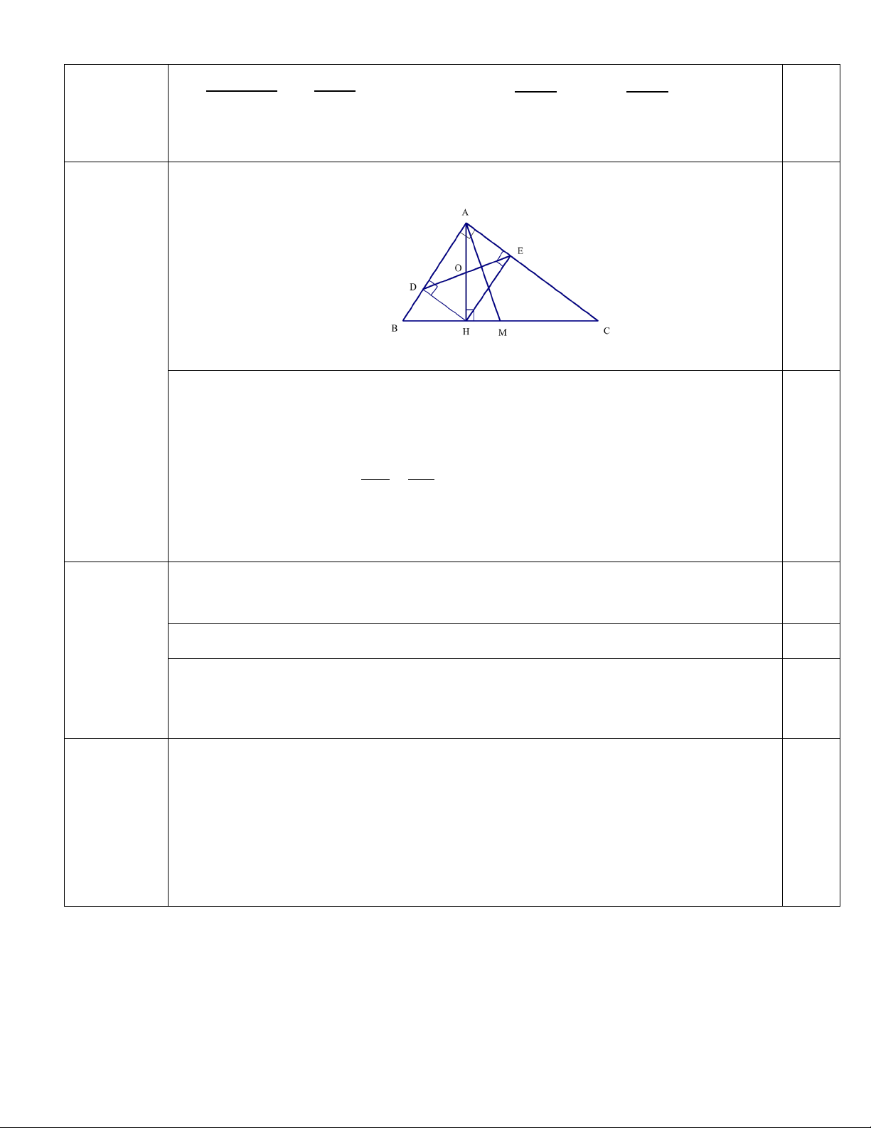AED MAC HAE MCA = 90 ⇒ DE ⊥ AM S d) (1đ) d. Theo giả thiết AED 1 S = S = S hay = ABC 2 ADHE 4 ADE (1) SABC 4 S AE AD AE AC AD AB AED . ( . ).( . ) 4 Ta có AH = = = 2 2 S AB AC AB AC AB AC ABC . ( . ) ( . ) 4 2 2 AH AH AM 1 1 = = ≤ = (2) 2 2 2 (AH.BC) BC BC 4 2 2 Từ (1) và (2) AH AM ⇒ =