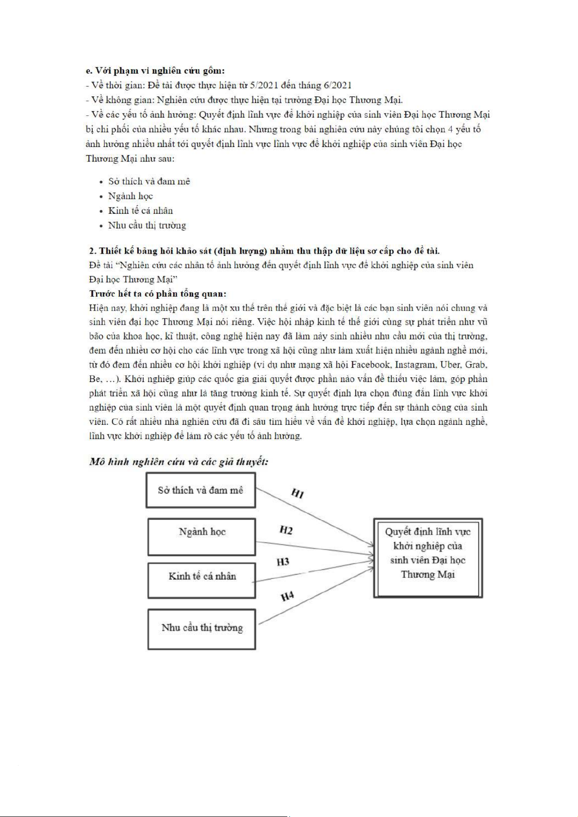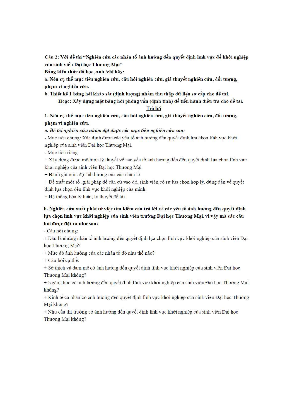 Với đề tài “Nghiên cứu các nhân tố ảnh hưởng đến quyết định lĩnh vực để khởi nghiệp của sinh viên Đại học Thương Mại”Bằng kiến thức đã học, anh /chị hãy: a. Nêu cụ thể mục tiêu nghiên cứu, câu hỏi nghiên cứu, giả thuyết nghiên cứu, đối tượng, phạm vi nghiên cứu. b. Thiết kế 1 bảng hỏi khảo sát (định lượng) nhằm thu thập dữ liệu sơ cấp cho đề tài. Tài liệu giúp bạn tham khảo, ôn tập và đạt kết quả cao. Mời đọc đón xem!
