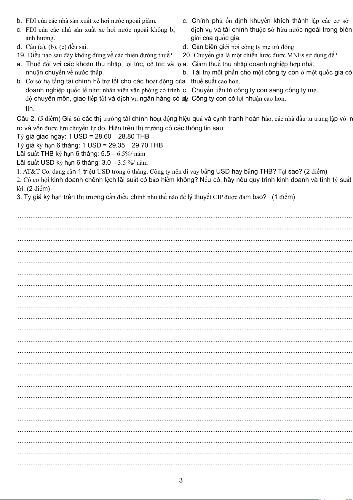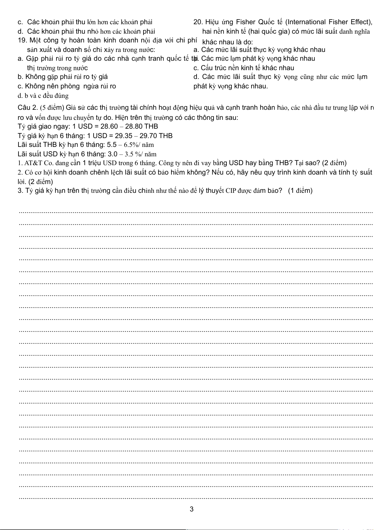 1. AT&T Co. đang cần 1 triệu USD trong 6 tháng. Công ty nên đi vay bằng USD hay bằng THB? Tại sao? (2 điểm)