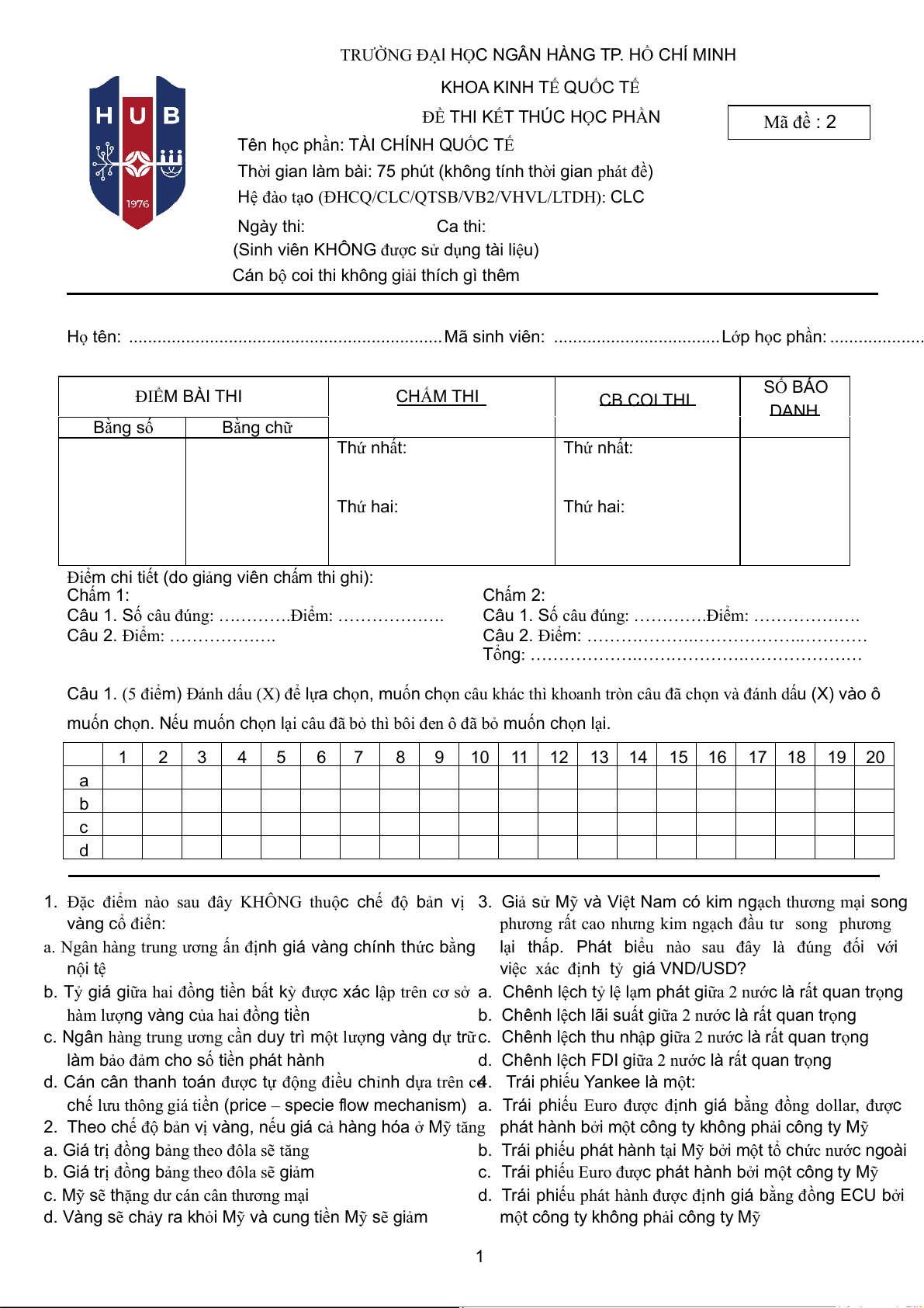 1. Đặc điểm nào sau đây KHÔNG thuộc chế độ bản vị 3. Giả sử Mỹ và Việt Nam có kim ngạch thương mại song vàng cổ điển: