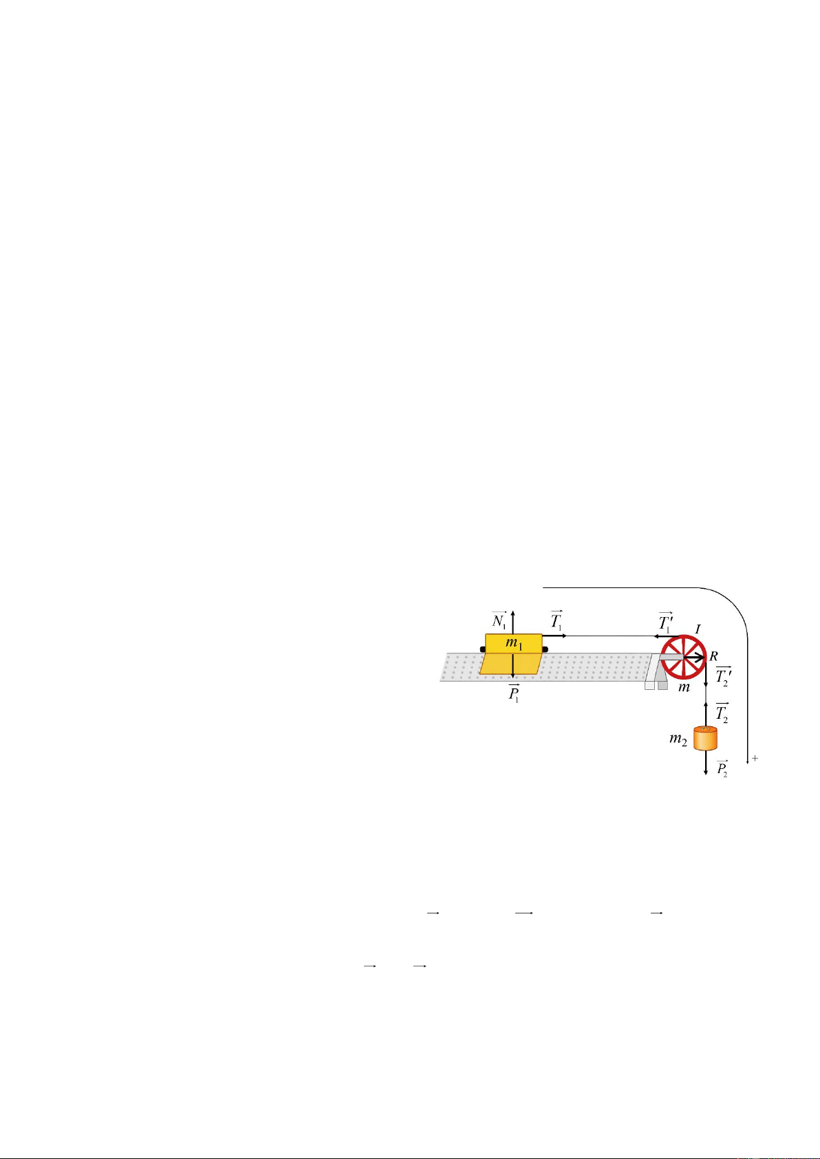 ra, m2 tăng tốc đi xuống, vật m1 tăng tốc trượt sang phải, ròng rọc quay không trượt.