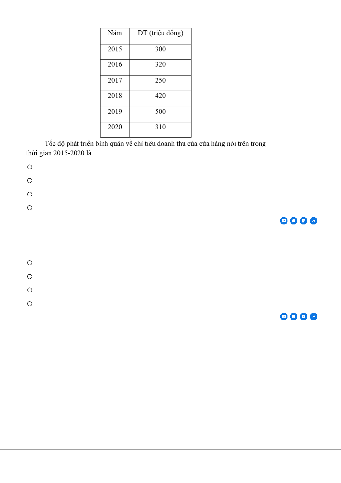 Doanh thu của một cửa hàng trong giai đoạn 2015-2020 là A. 350 triệu đồng B. 100,66% C. 0,66% D. Không nên tính Câu 9