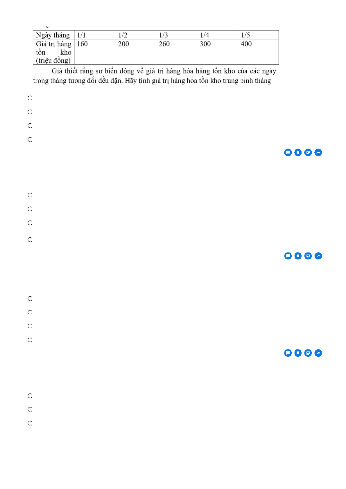 Có số liệu về giá trị hàng hóa tồn kho của một xí nghiệp vào các ngày đầu tháng như sau A. 252 B. 247 C. 286 D. 260 1 Câu 21