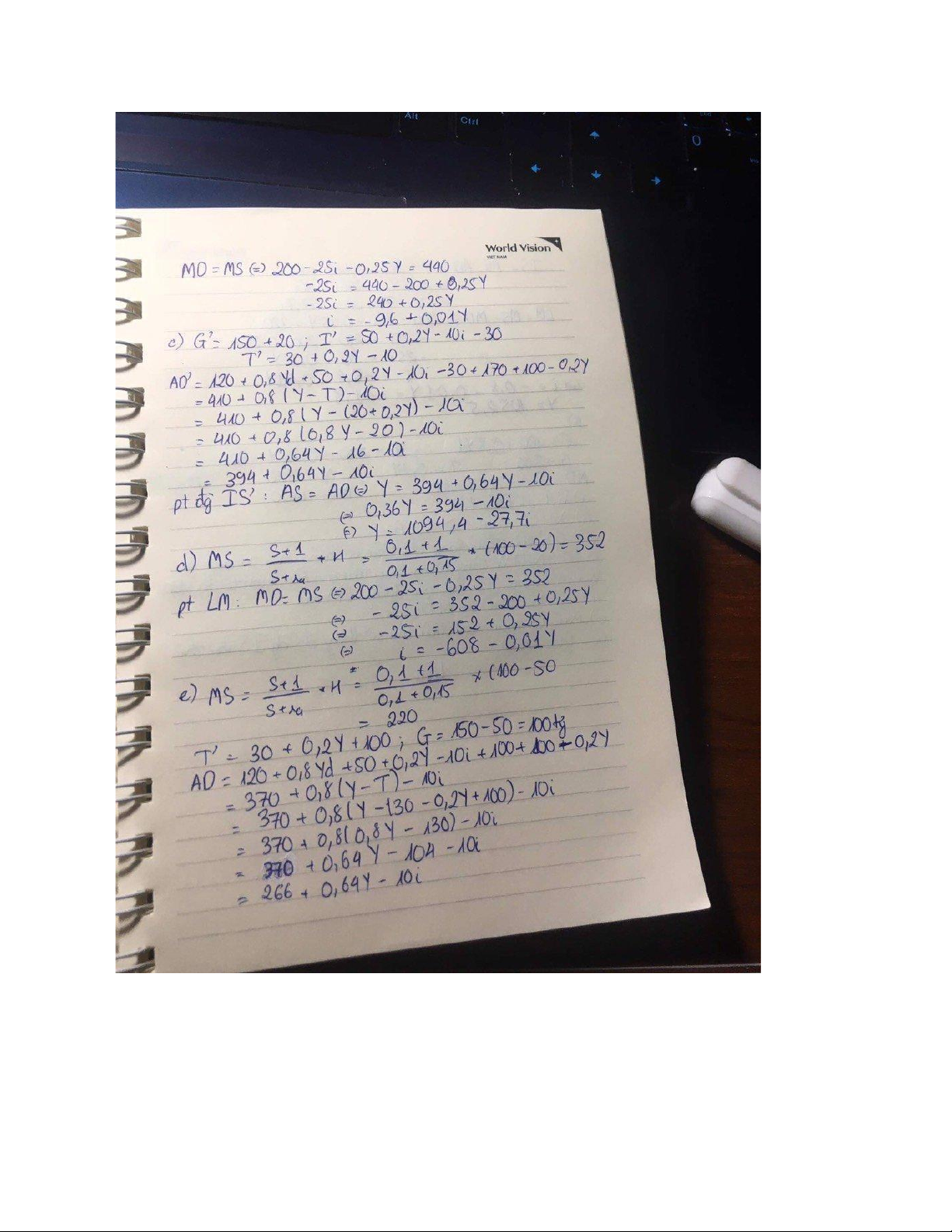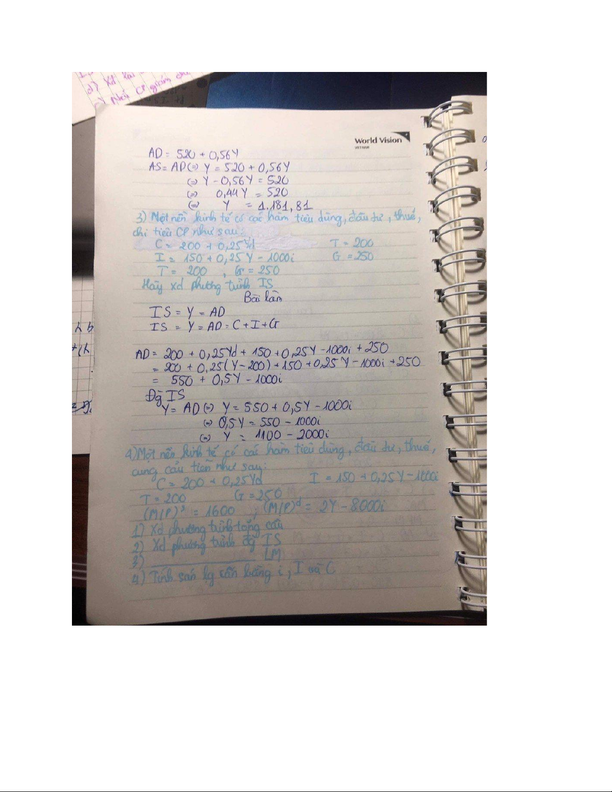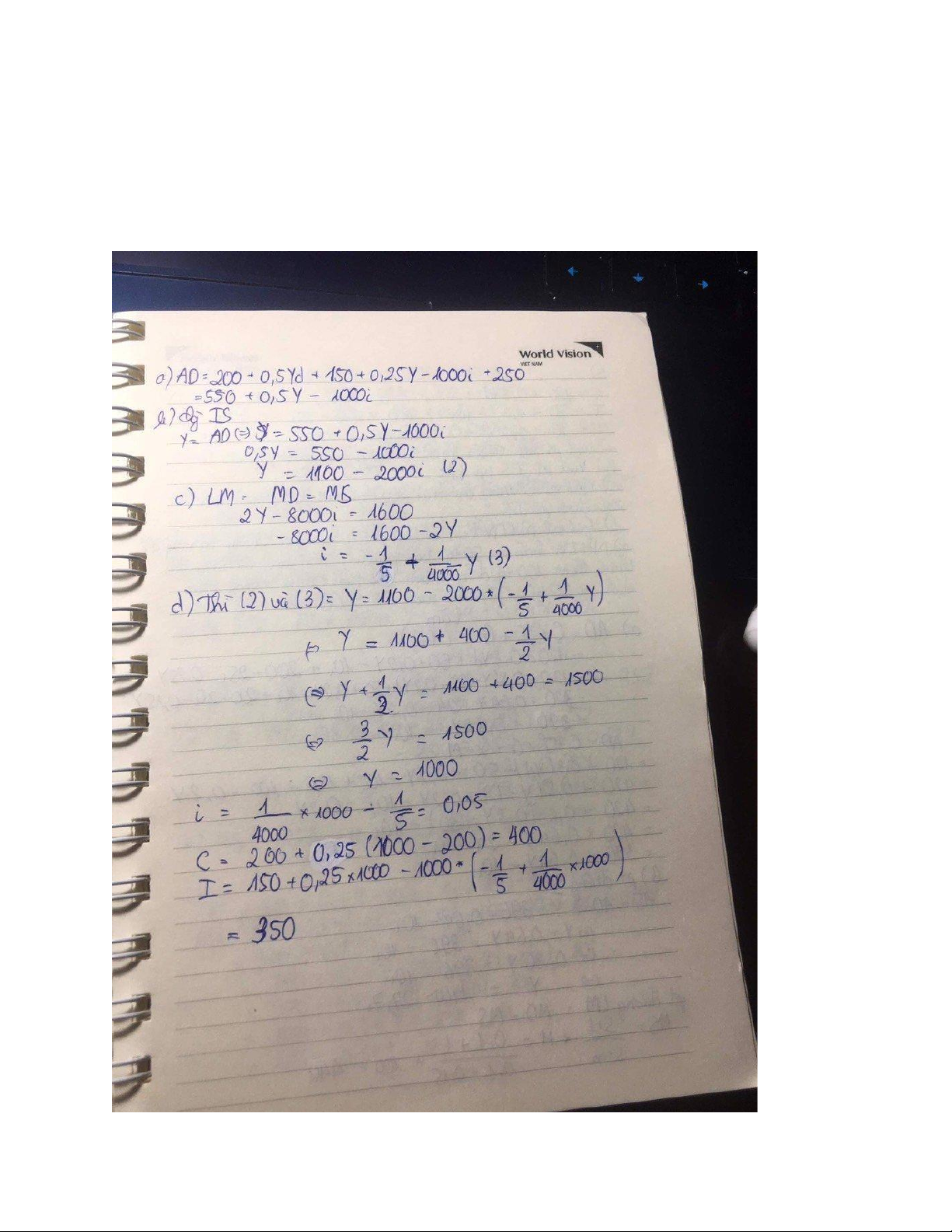 Bài 4: Một nền kinh tế có hàm tiêu dùng, đầu tư, thuế, cung cầu tiền như sau: C = 200 + 0,25Yd I = 150 + 0,25Y -1000i T = 200 G = 250 (M/P)s = 1600 (M/P)d = 2Y - 8000i 1)
