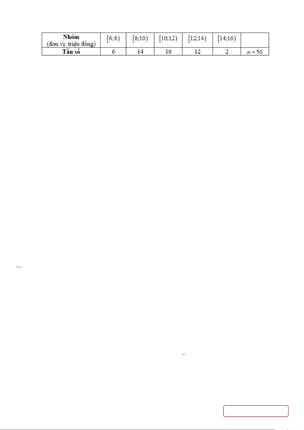 Câu 12. Mẫu số liệu ghép nhóm thống kê mức lương của một công ty (đơn vị: triệu đồng) được cho trong bảng dưới đây: