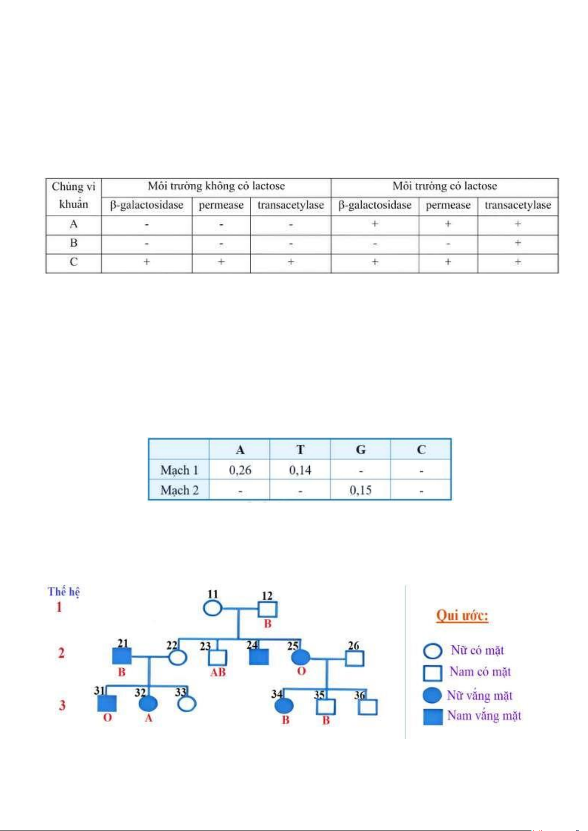 Câu 1. Một gene tương ứng các nucleotide ở các mạch đơn thể hiện ở bảng dưới đây. Biết tổng tỷ lệ các loại