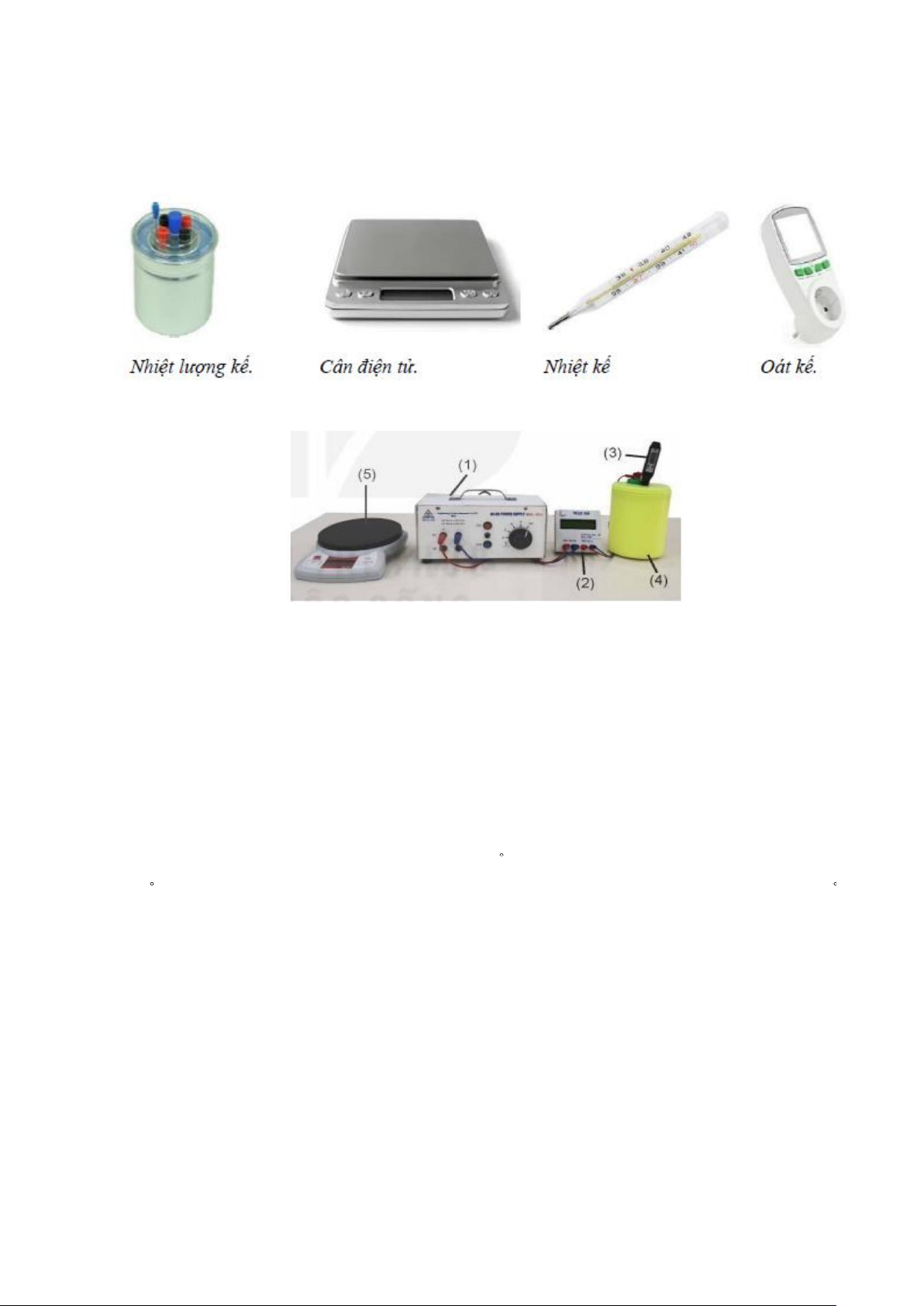 Câu 16. Hình bên dưới là các dụng cụ để đo nhiệt dung riêng của nước. Dụng cụ số (3) là A. Cân điện tử.