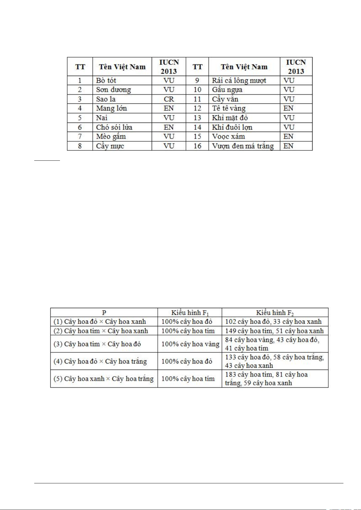 Câu 3. Bảng dưới đây là danh sách một số loài thú tại khu dự trữ sinh quyển miền Tây Nghệ An được