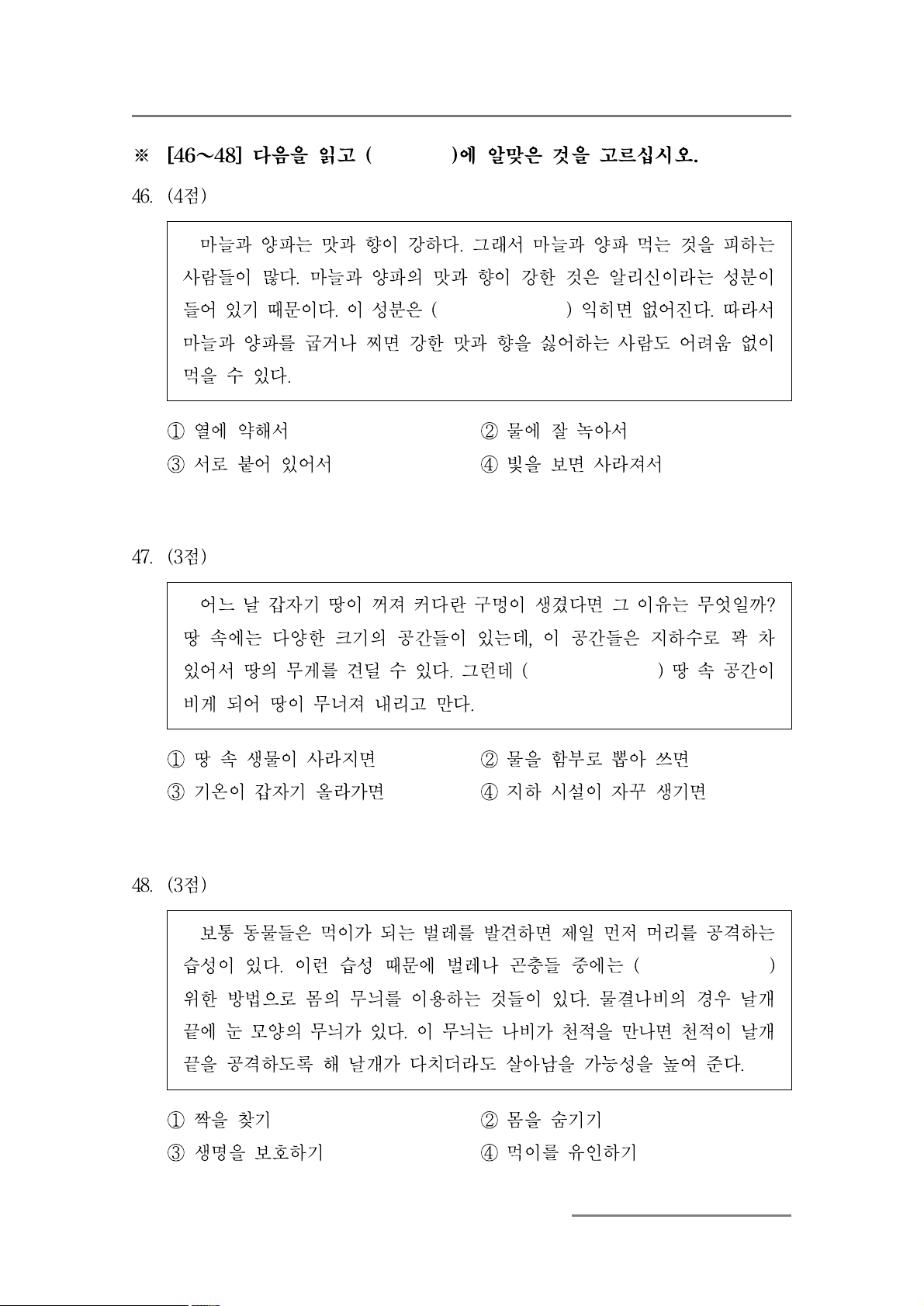 마늘과 양파를 굽거나 찌면 강한 맛과 향을 싫어하는 사람도 어려움 없이 먹을 수 있다. ① 열에 약해서 ② 물에 잘 녹아서 ③ 서로 붙어 있어서 ④ 빛을 보면 사라져서 47. (3점)