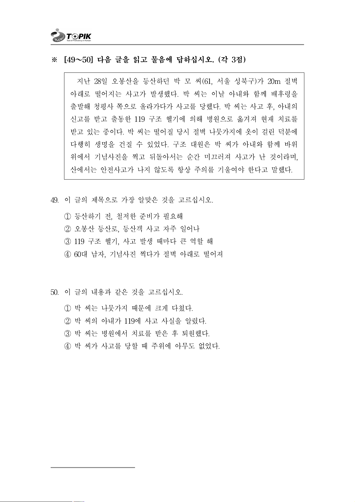 ④ 박 씨가 사고를 당할 때 주위에 아무도 없었다. 16 중급 이해 (듣기, 읽기)