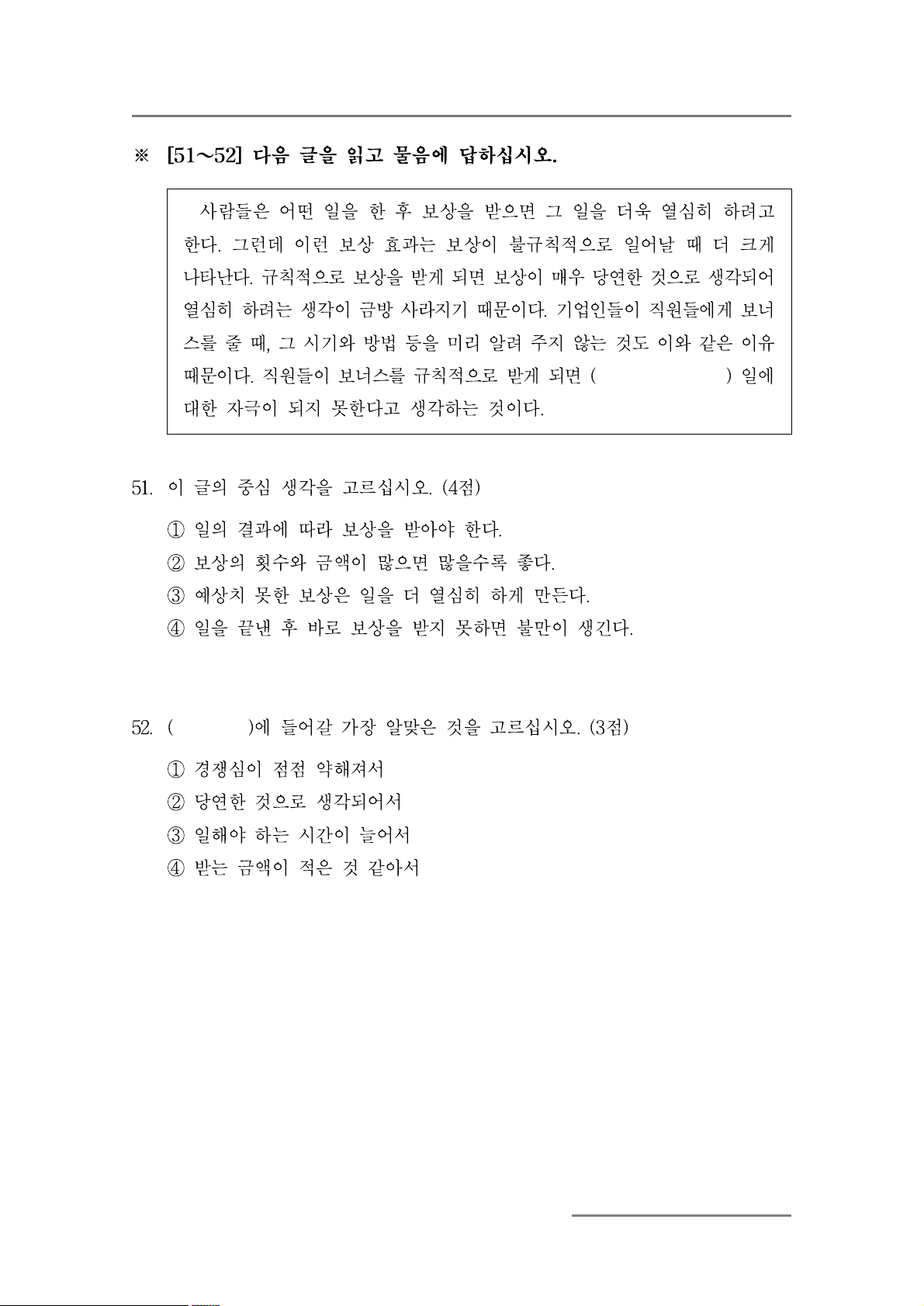 ④ 일을 끝낸 후 바로 보상을 받지 못하면 불만이 생긴다. 52. (
