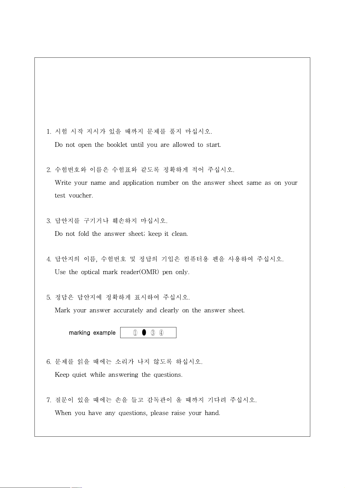 7. 질문이 있을 때에는 손을 들고 감독관이 올 때까지 기다려 주십시오.