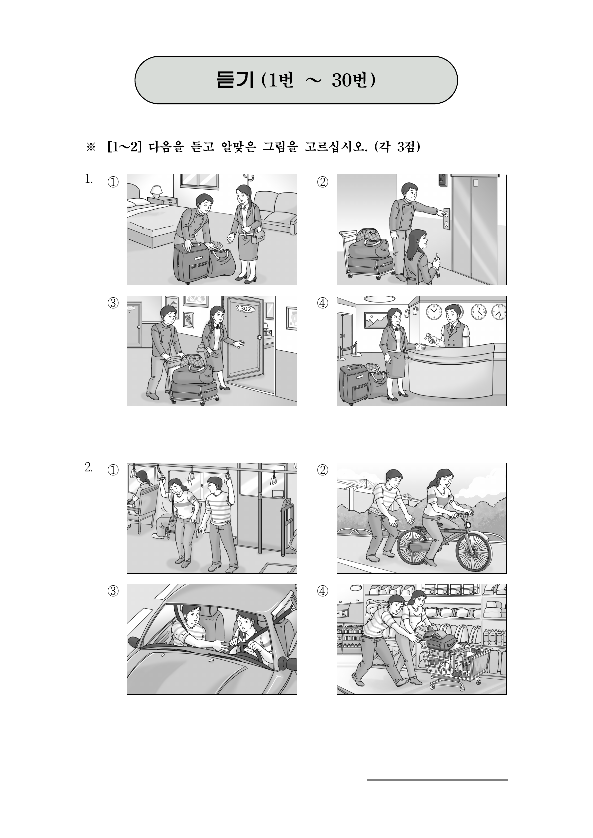 ※ [1~2] 다음을 듣고 알맞은 그림을 고르십시오. (각 3점) 1. ① ② ③ ④ 2. ① ② ③ ④