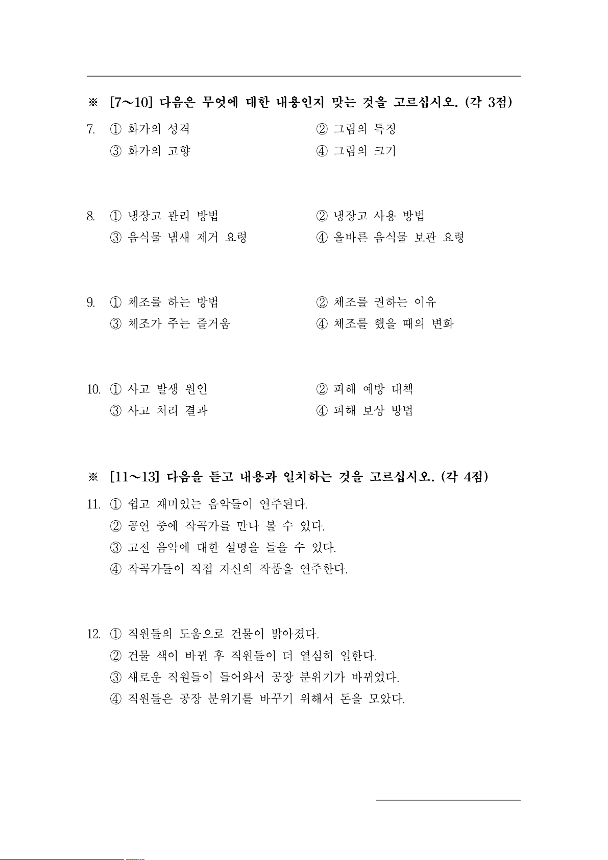 ※ [11~13] 다음을 듣고 내용과 일치하는 것을 고르십시오. (각 4점)