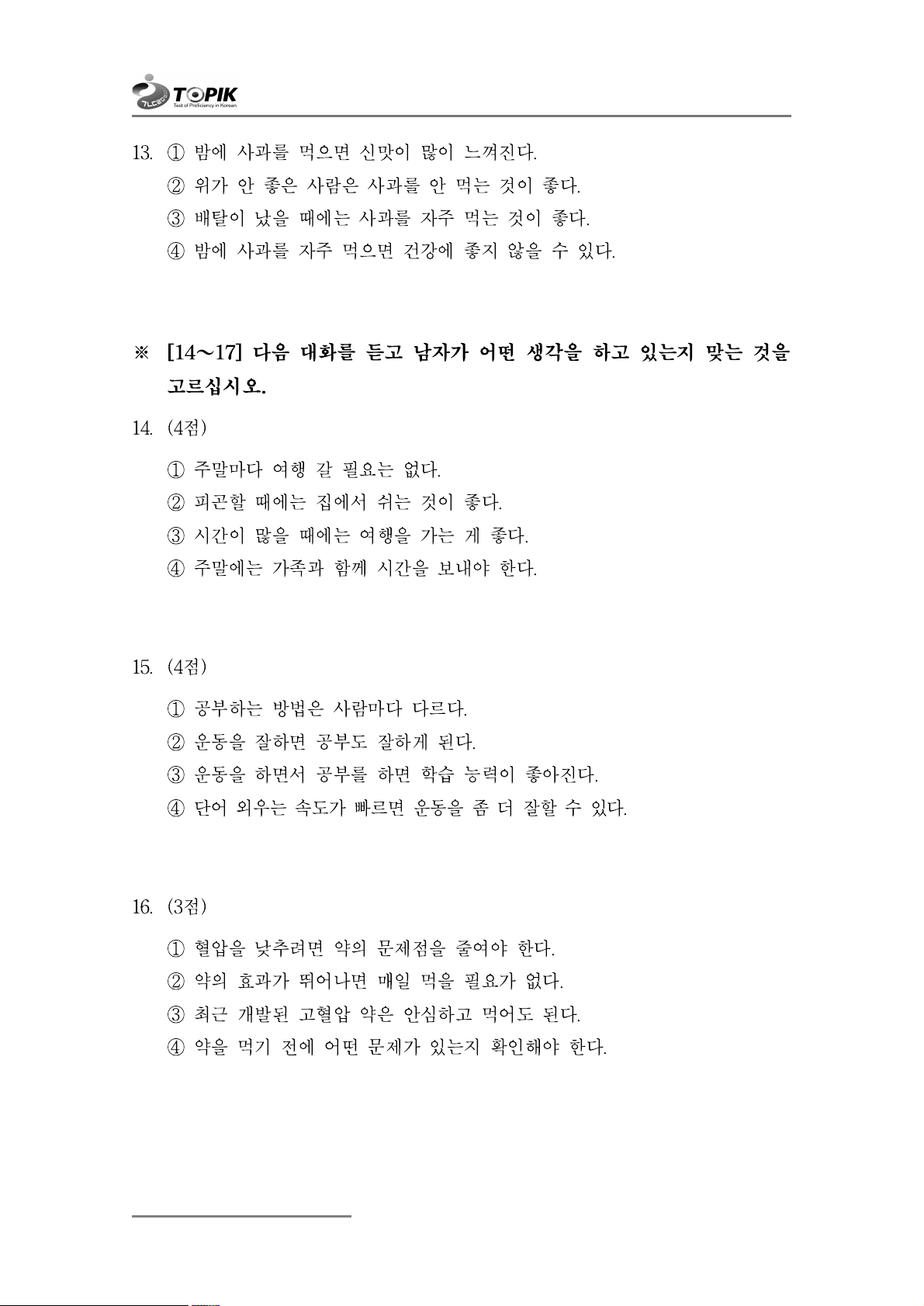※ [14~17] 다음 대화를 듣고 남자가 어떤 생각을 하고 있는지 맞는 것을 고르십시오. 14. (4점)