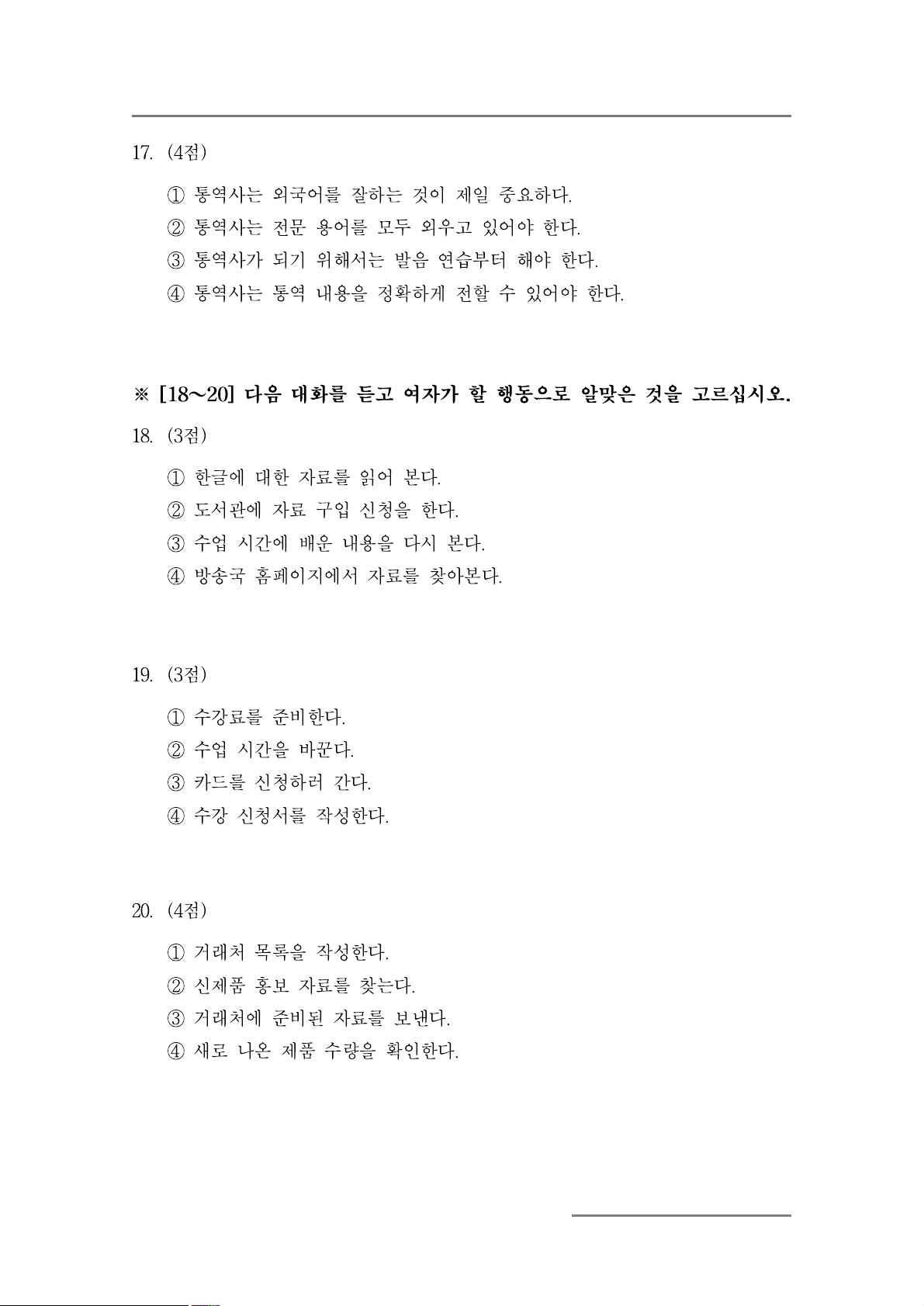 ④ 방송국 홈페이지에서 자료를 찾아본다. 19. (3점) ① 수강료를 준비한다.