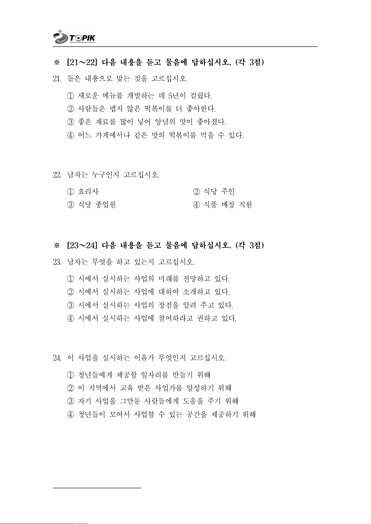※ [21~22] 다음 내용을 듣고 물음에 답하십시오. (각 3점)