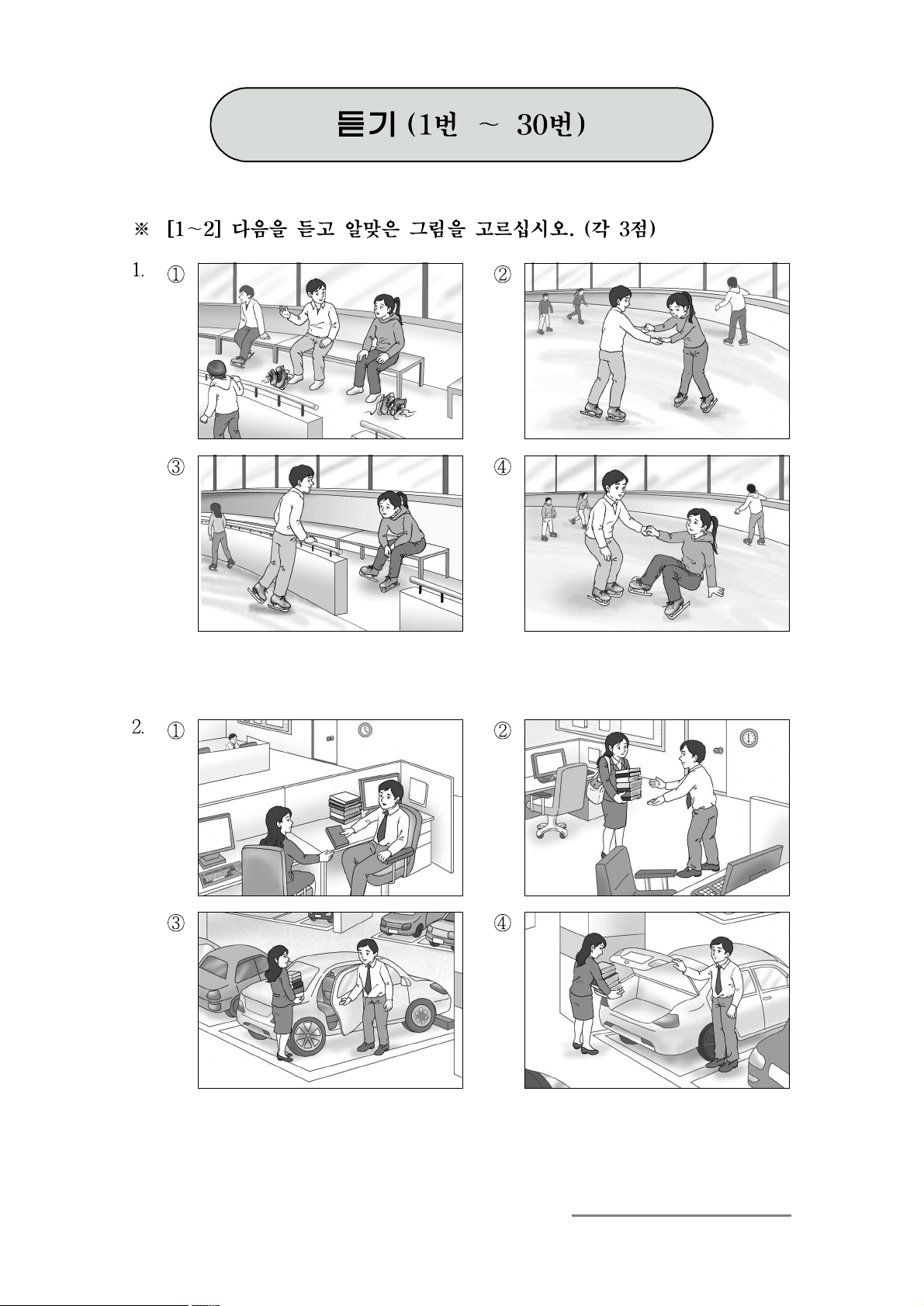 ※ [1~2] 다음을 듣고 알맞은 그림을 고르십시오. (각 3점) 1. ① ② ③ ④ 2. ① ② ③ ④