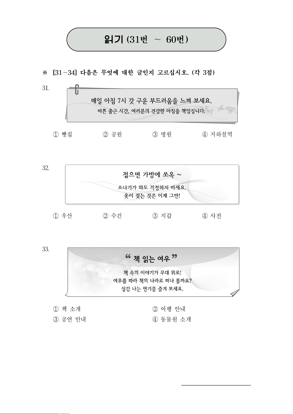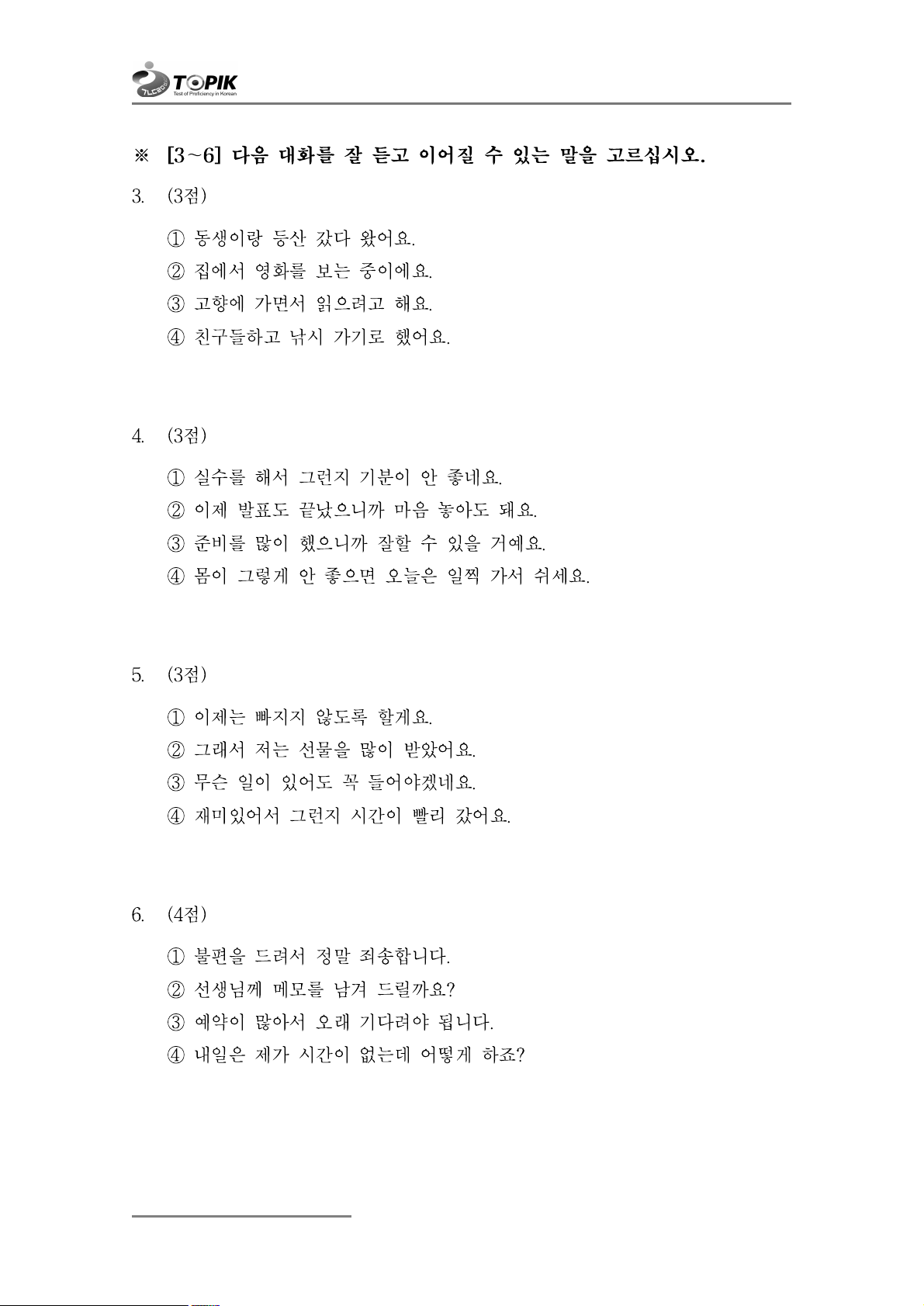 ※ [3~6] 다음 대화를 잘 듣고 이어질 수 있는 말을 고르십시오. 3. (3점)