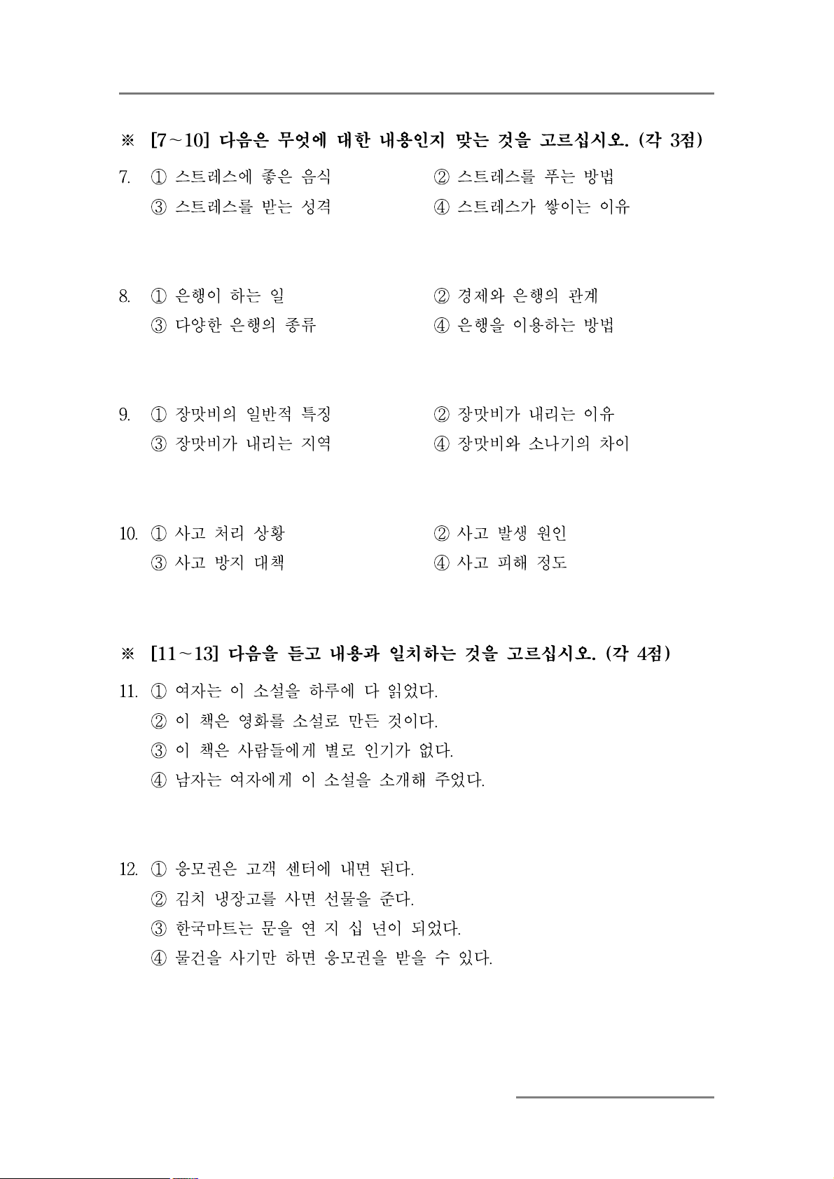 ※ [11~13] 다음을 듣고 내용과 일치하는 것을 고르십시오. (각 4점)