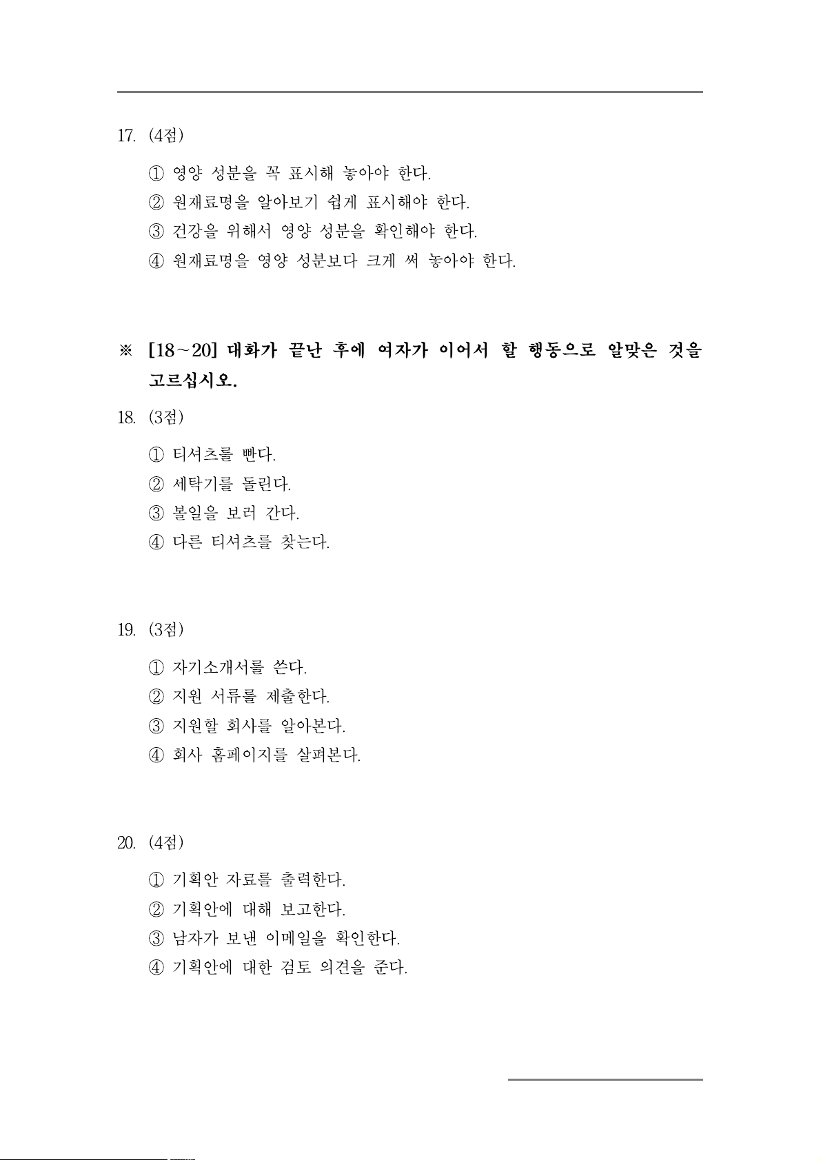④ 다른 티셔츠를 찾는다. 19. (3점) ① 자기소개서를 쓴다.