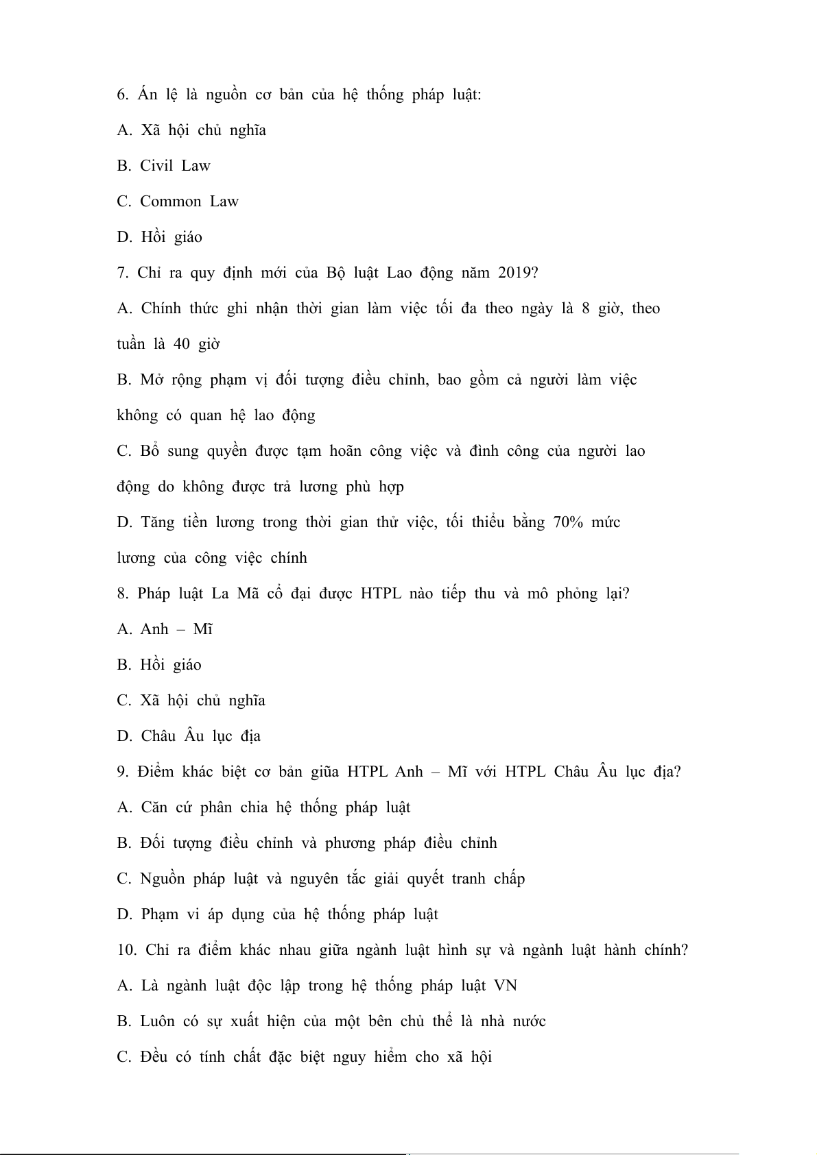 6. Án lệ là nguồn cơ bản của hệ thống pháp luật: A. Xã hội chủ nghĩa B. Civil Law C. Common Law D. Hồi giáo