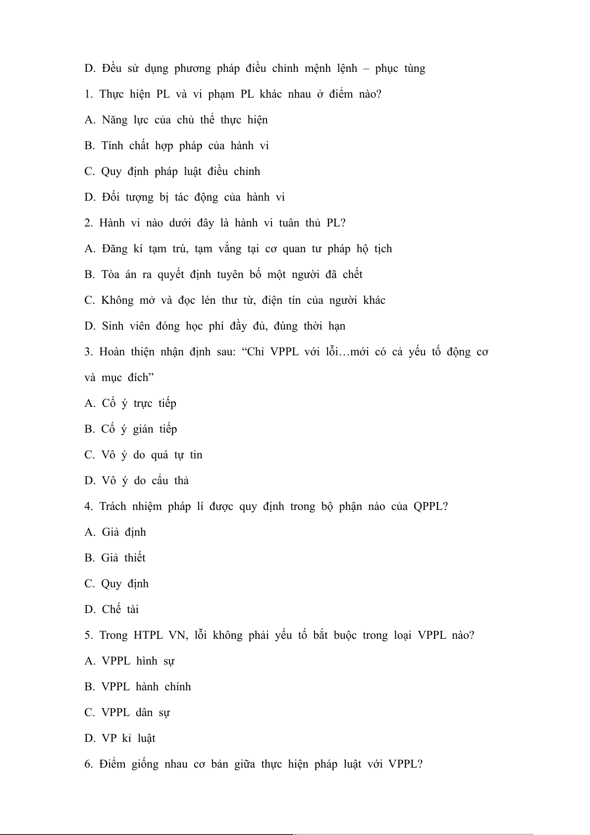 5. Trong HTPL VN, lỗi không phải yếu tố bắt buộc trong loại VPPL nào? A. VPPL hình sự B. VPPL hành chính C. VPPL dân sự D. VP kỉ luật