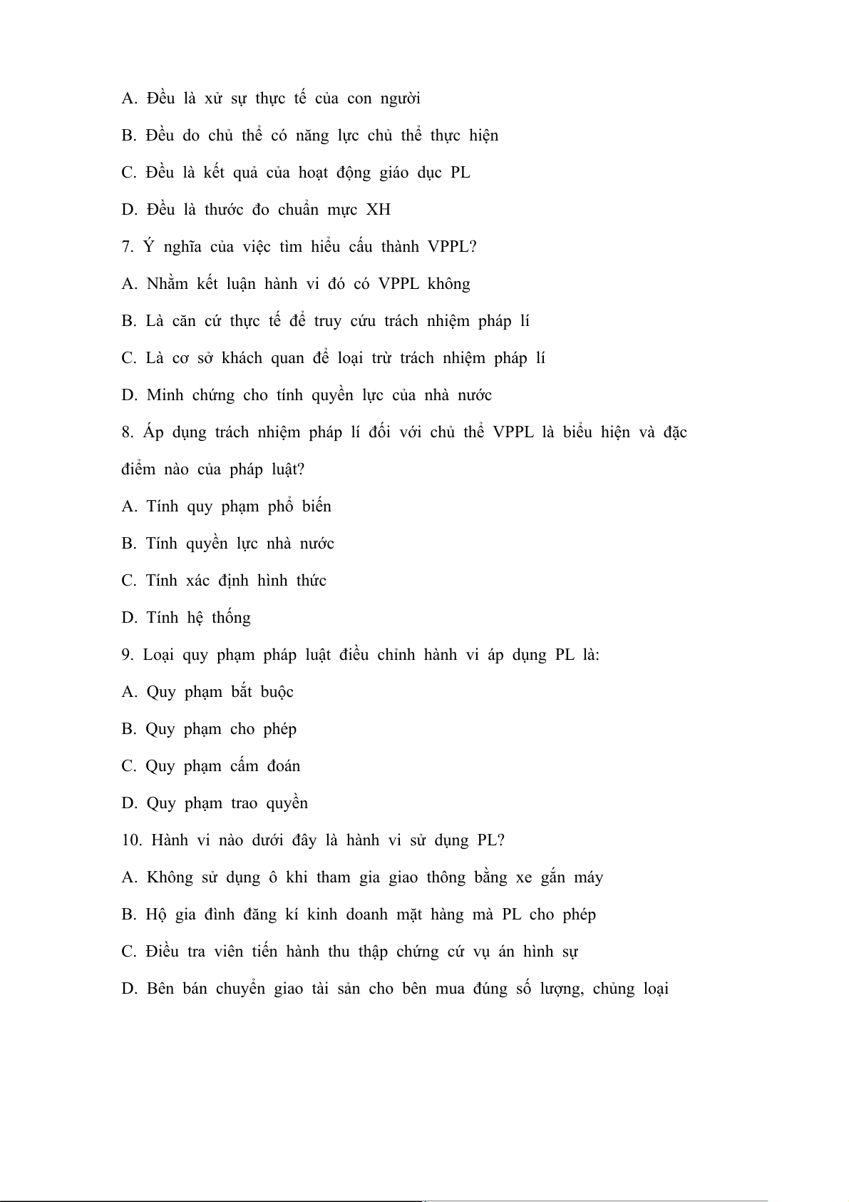 9. Loại quy phạm pháp luật điều chỉnh hành vi áp dụng PL là: A. Quy phạm bắt buộc B. Quy phạm cho phép C. Quy phạm cấm đoán D. Quy phạm trao quyền