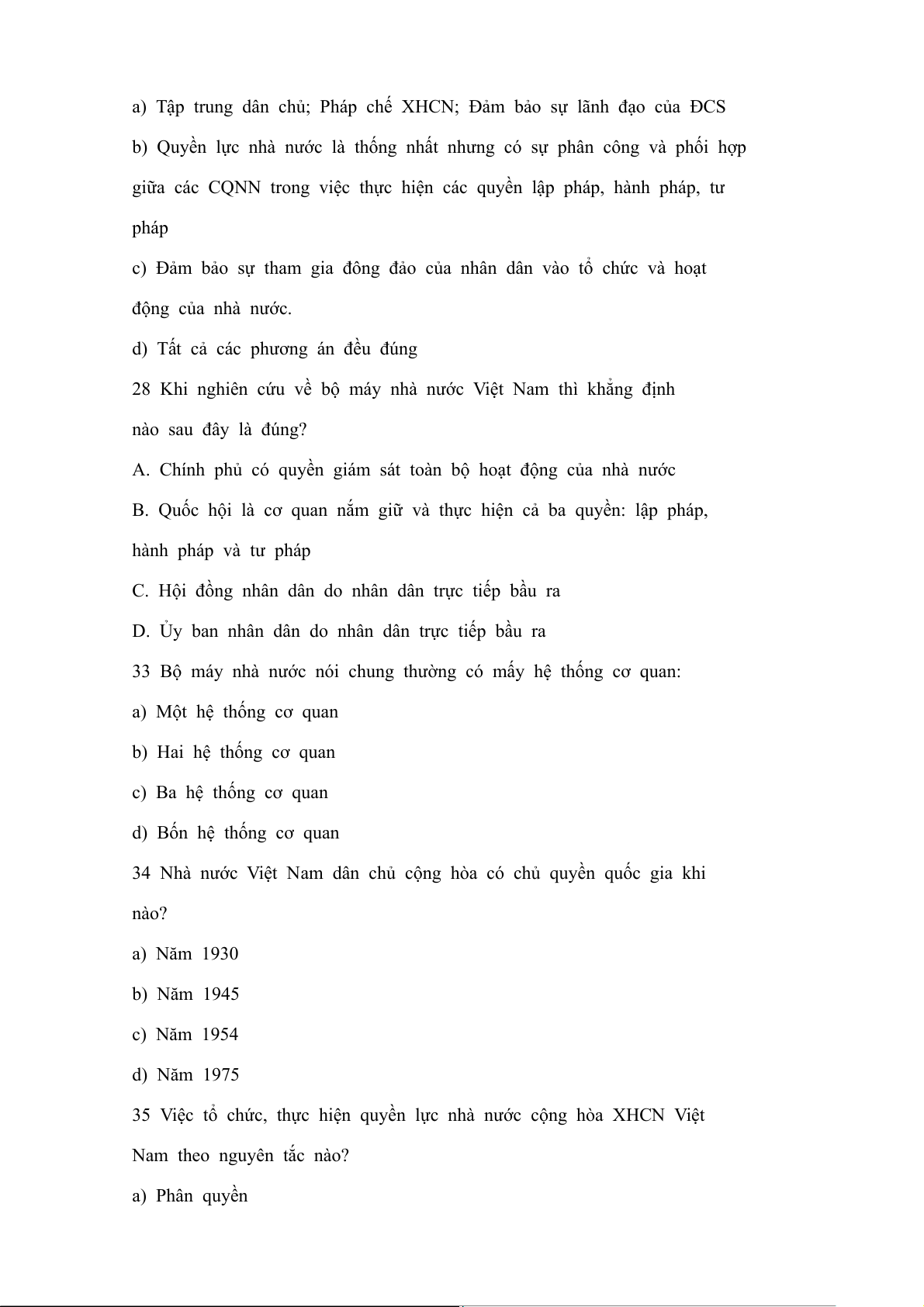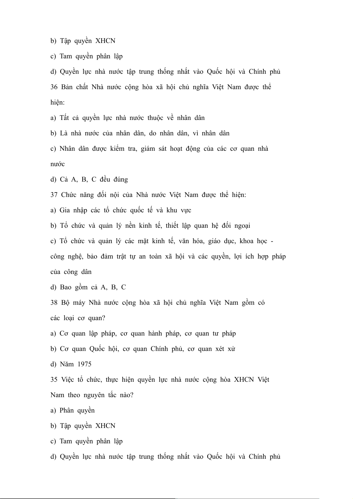 35 Việc tổ chức, thực hiện quyền lực nhà nước cộng hòa XHCN Việt Nam theo nguyên tắc nào? a) Phân quyền b) Tập quyền XHCN c) Tam quyền phân lập