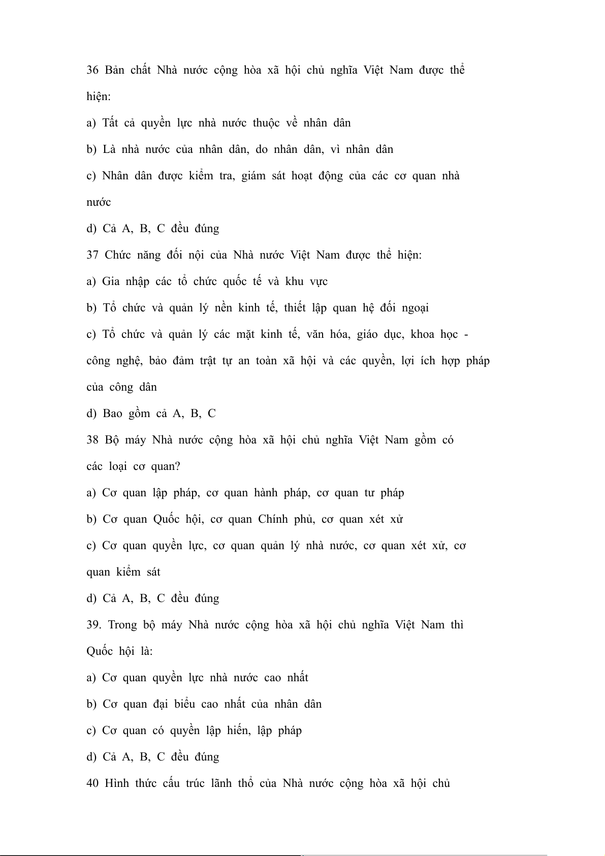 40 Hình thức cấu trúc lãnh thổ của Nhà nước cộng hòa xã hội chủ nghĩa Việt Nam là: a) Nhà nước đơn nhất b) Nhà nước liên bang c) Nhà nước liên minh d) Nhà nước tự trị