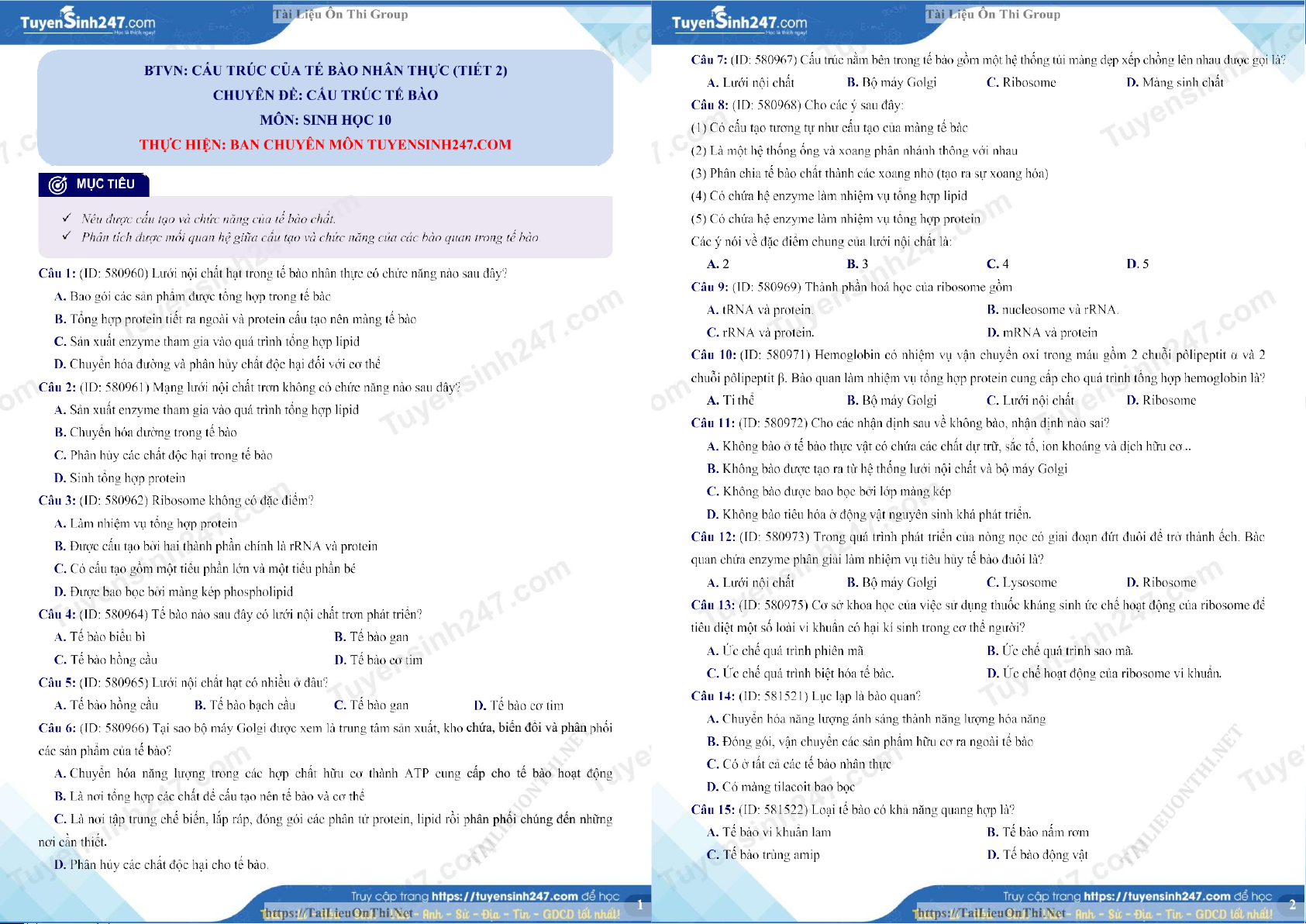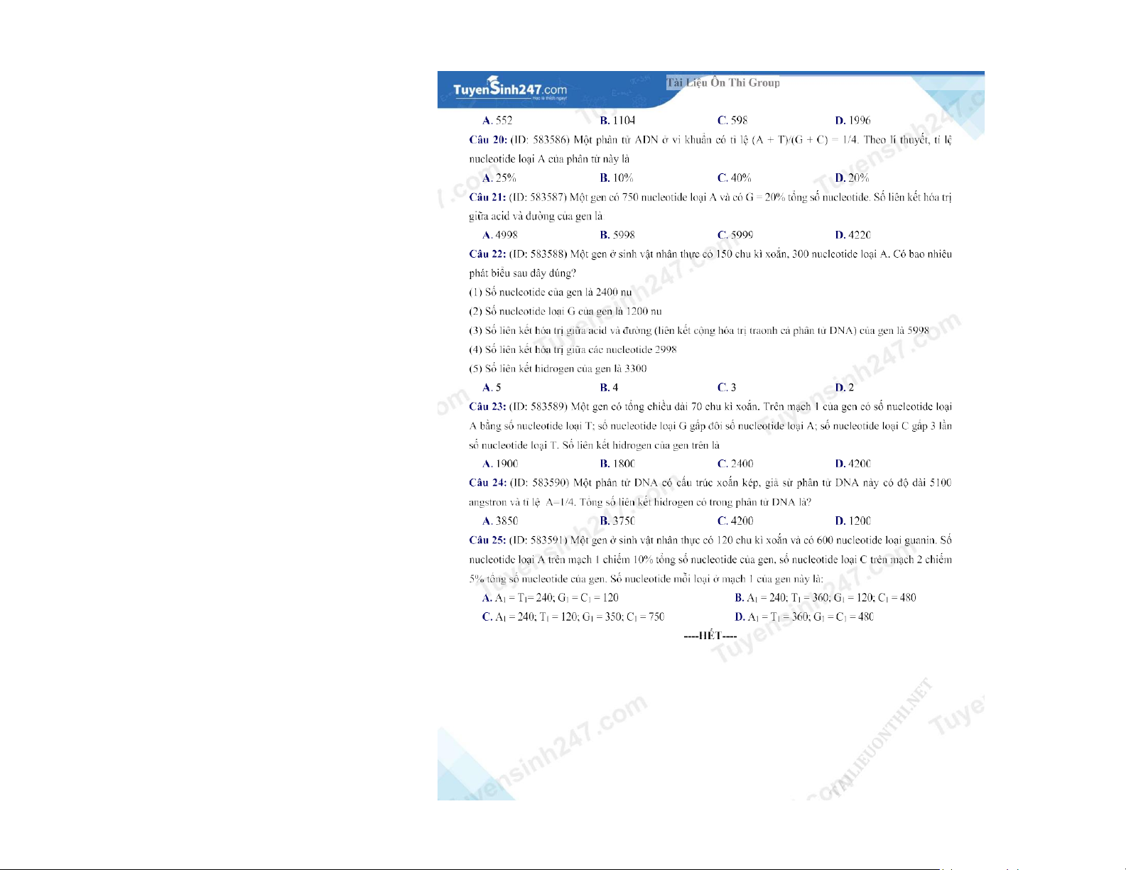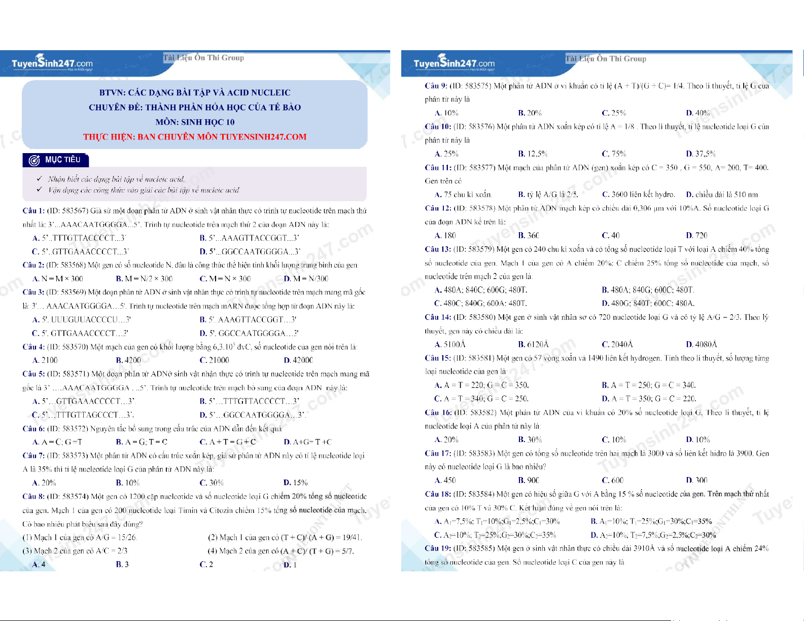Bộ câu hỏi trắc nghiệm sinh học phân tử –Trường Đại học Nguyễn Tất Thành
