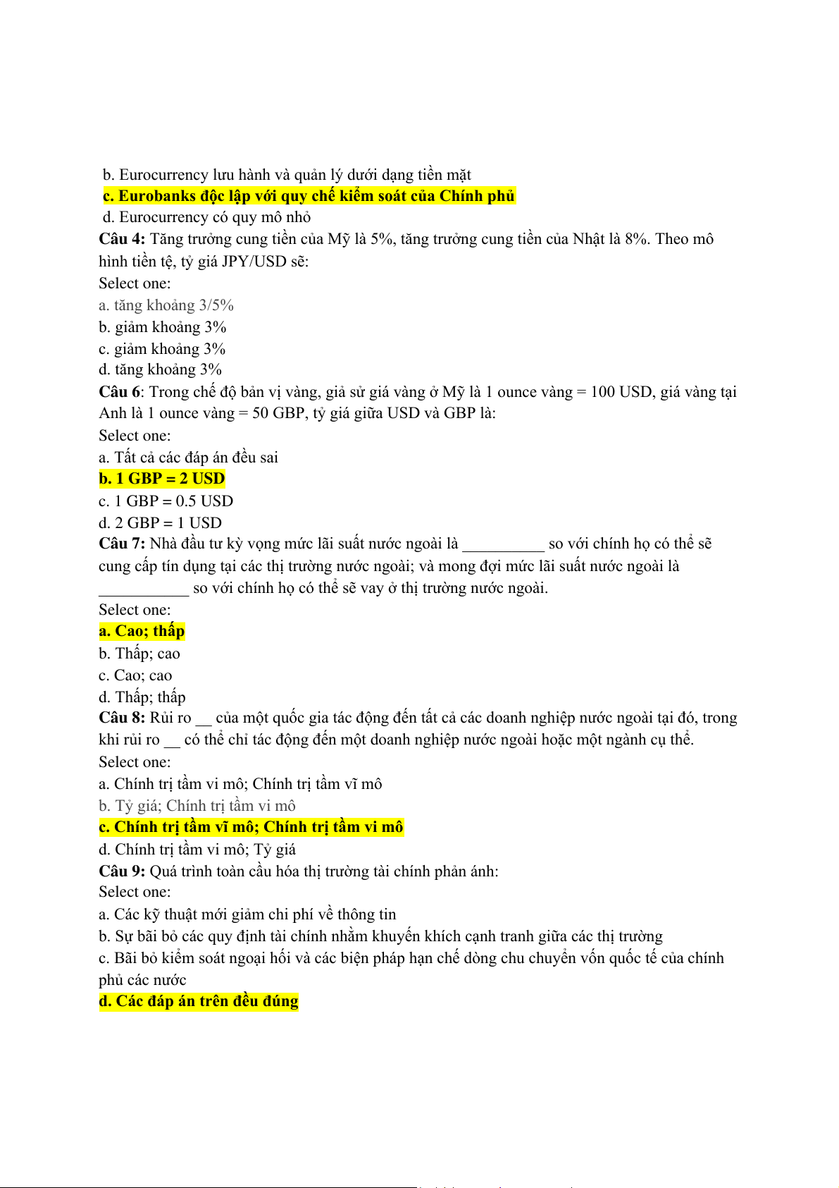 d. Ổn định tỷ giá, độc lập tiền tệ, hội nhập tài chính quốc tế. Câu hỏi 9
