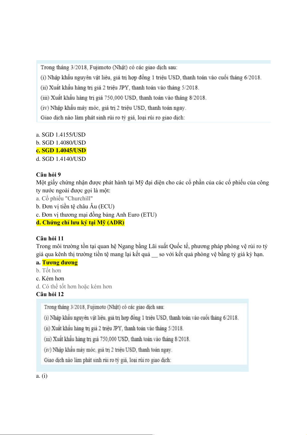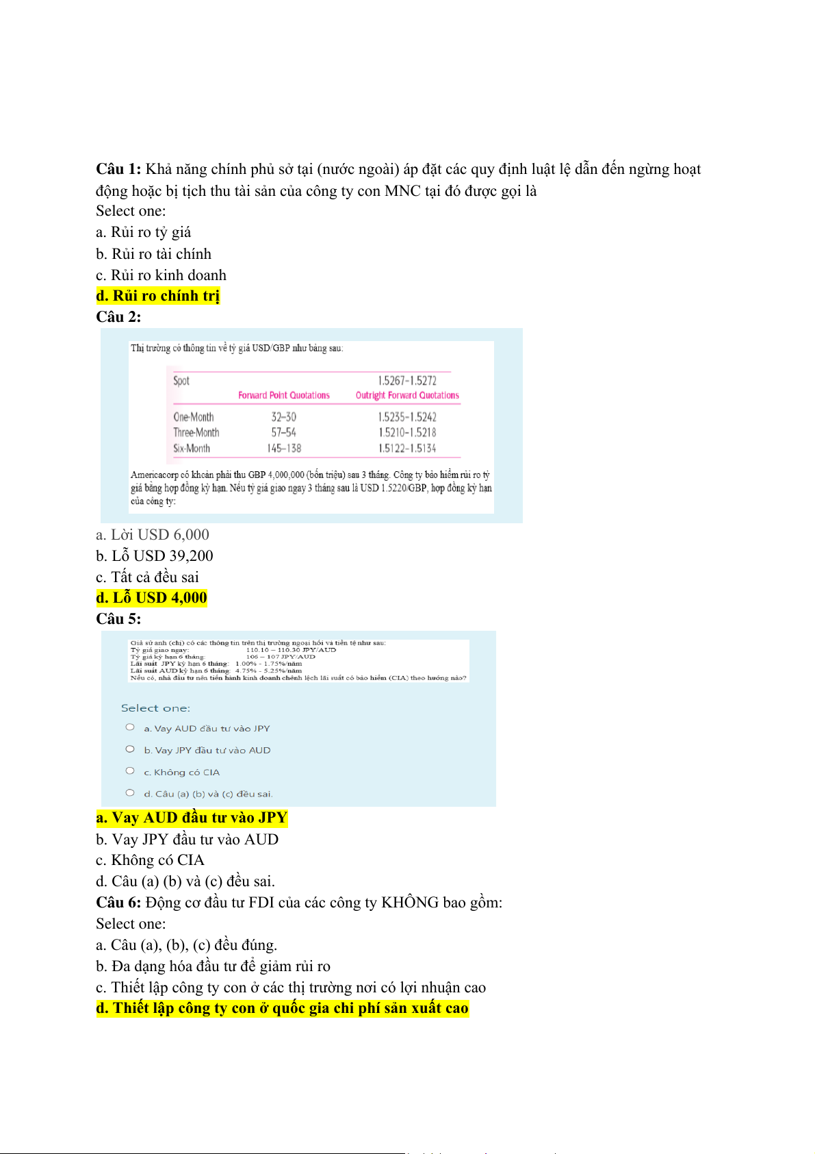 d. Rủi ro chính trị Câu 2: a. Lời USD 6,000 b. Lỗ USD 39,200 c. Tất cả đều sai d. Lỗ USD 4,000 Câu 5: