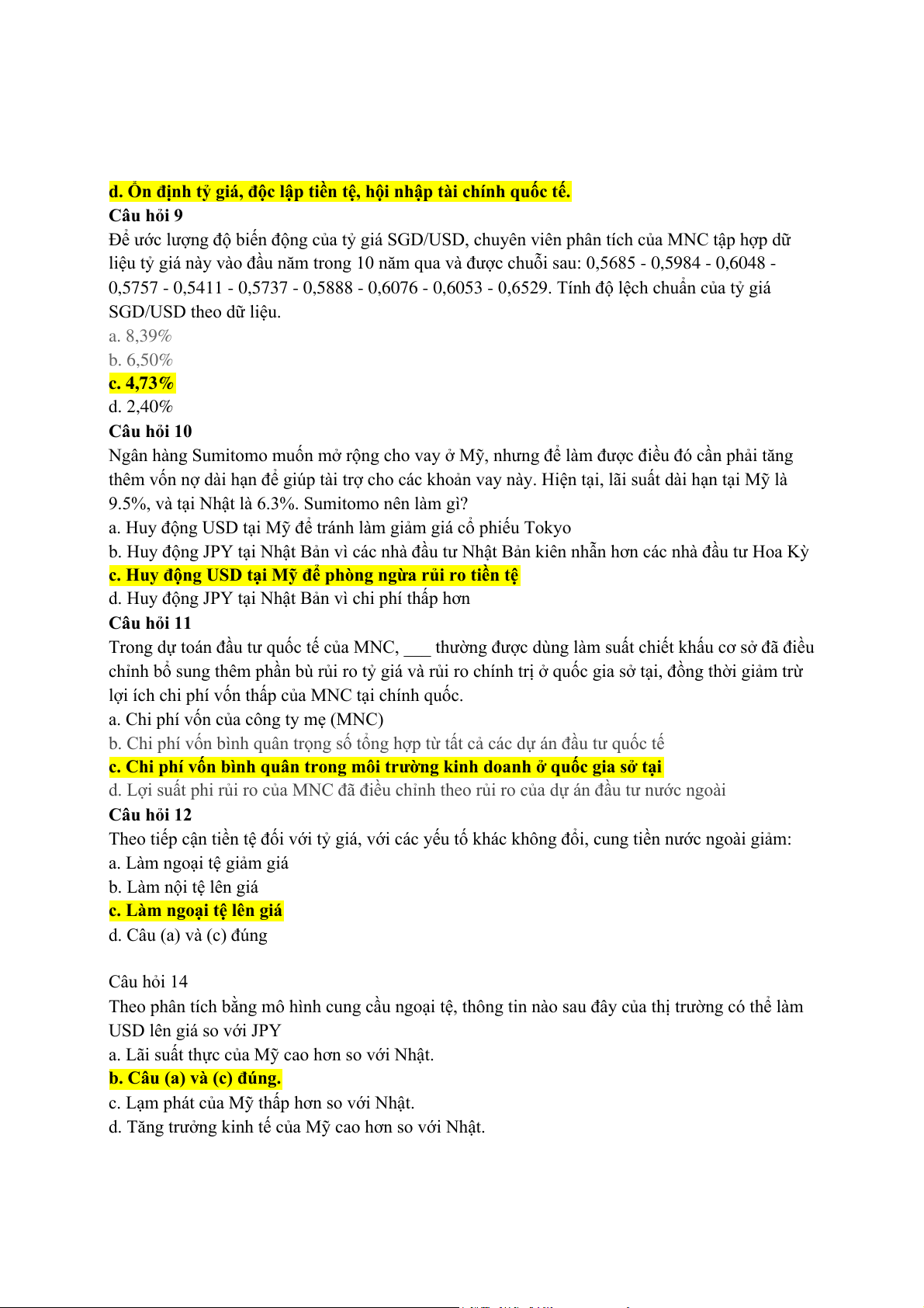 d. Lợi suất phi rủi ro của MNC đã điều chỉnh theo rủi ro của dự án đầu tư nước ngoài Câu hỏi 12