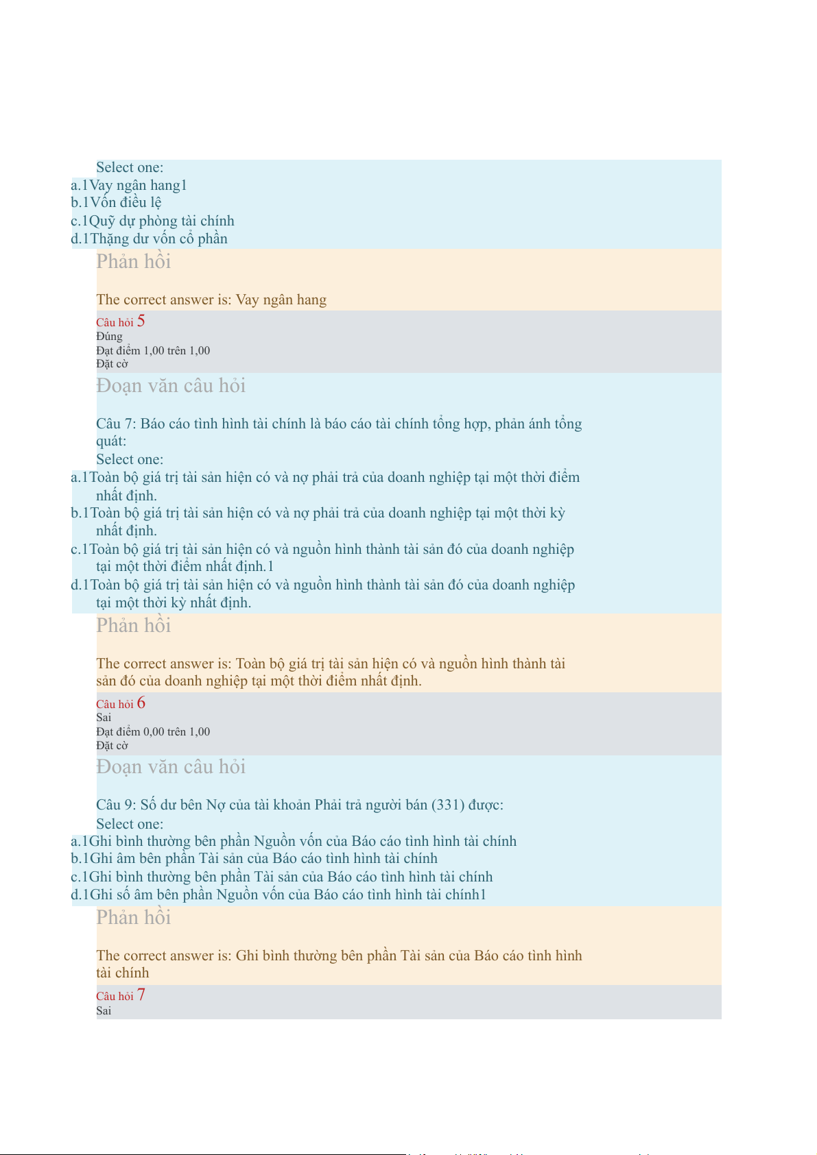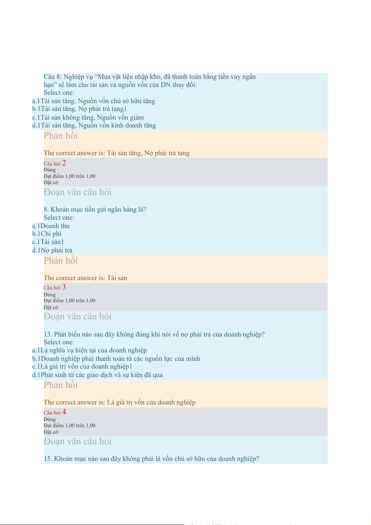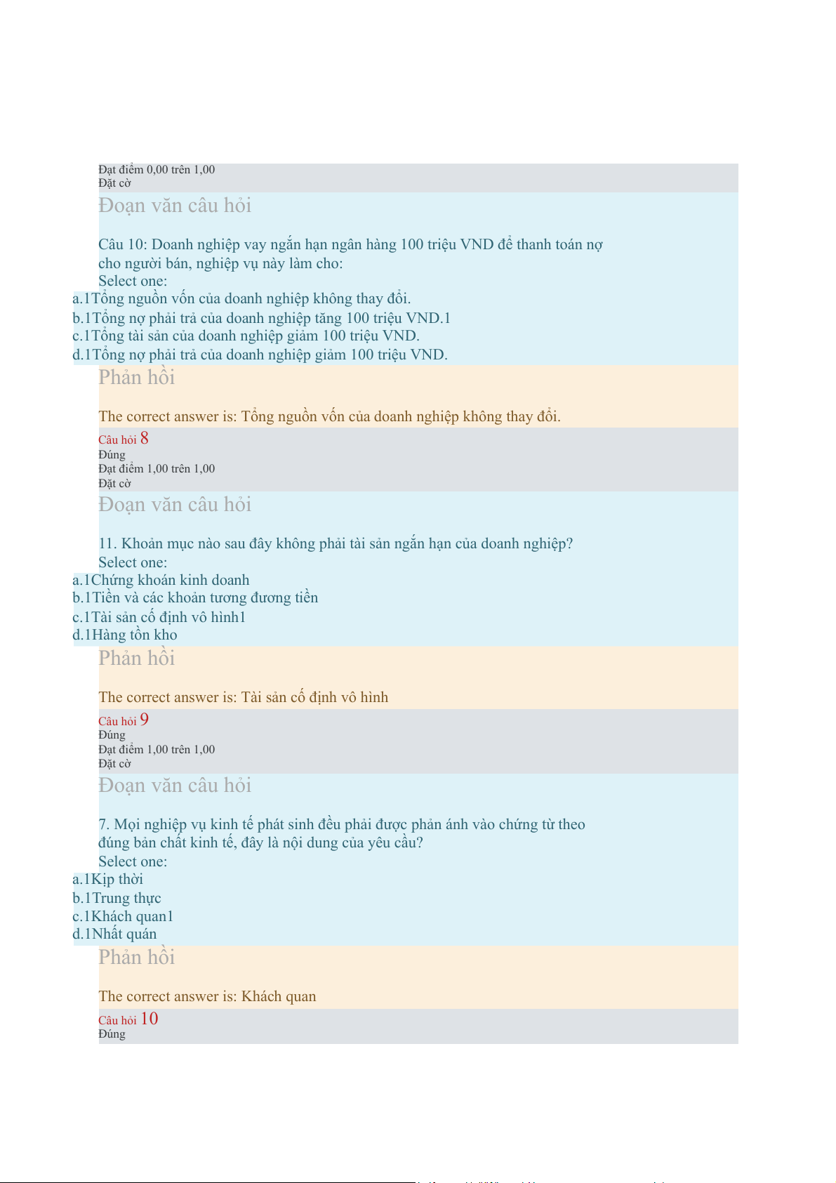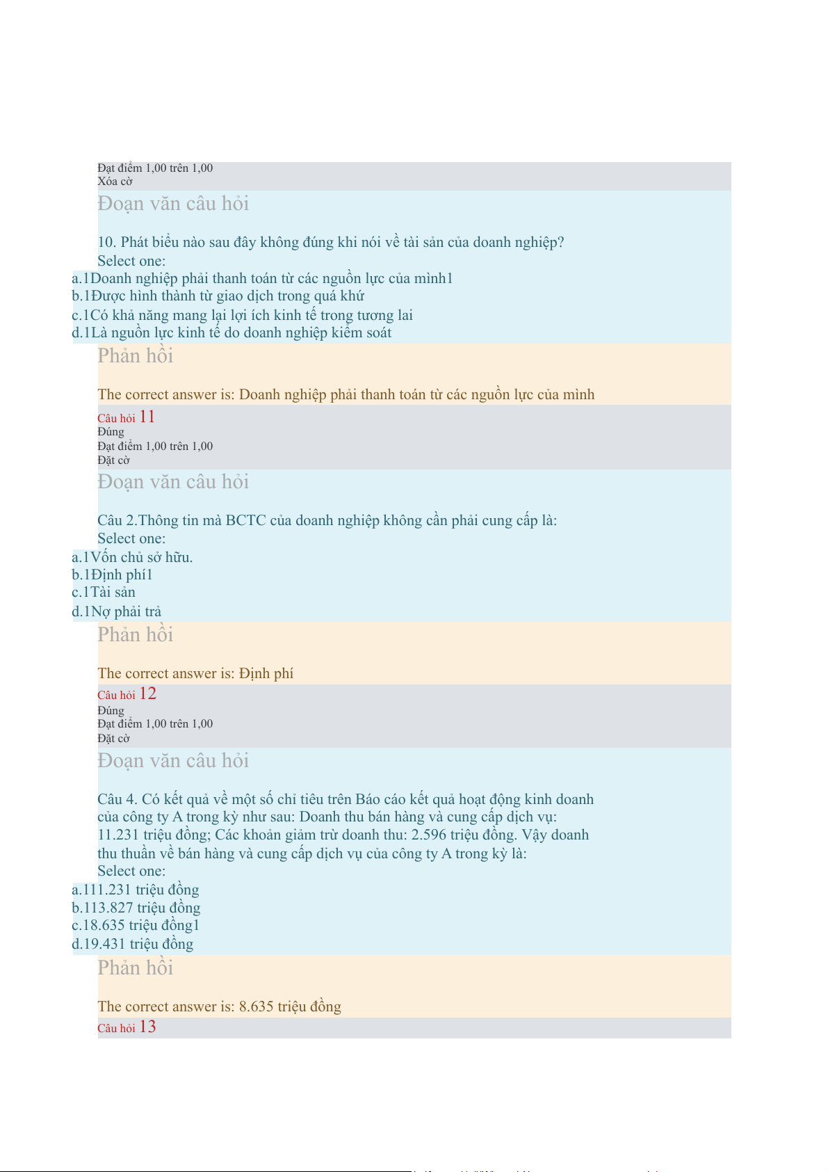 sản đó của doanh nghiệp tại một thời điểm nhất định. Câu hỏi 6 Sai Đạt điểm 0,00 trên 1,00 Đặt cờ Đoạn văn câu hỏi