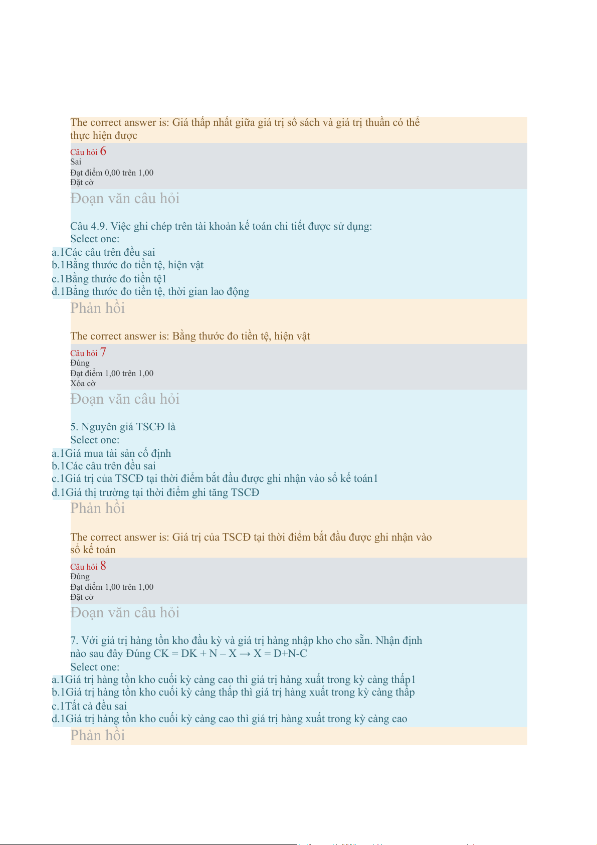 The correct answer is: Bằng thước đo tiền tệ, hiện vật Câu hỏi 7 Đúng Đạt điểm 1,00 trên 1,00 Xóa cờ Đoạn văn câu hỏi 5. Nguyên giá TSCĐ là Select one: