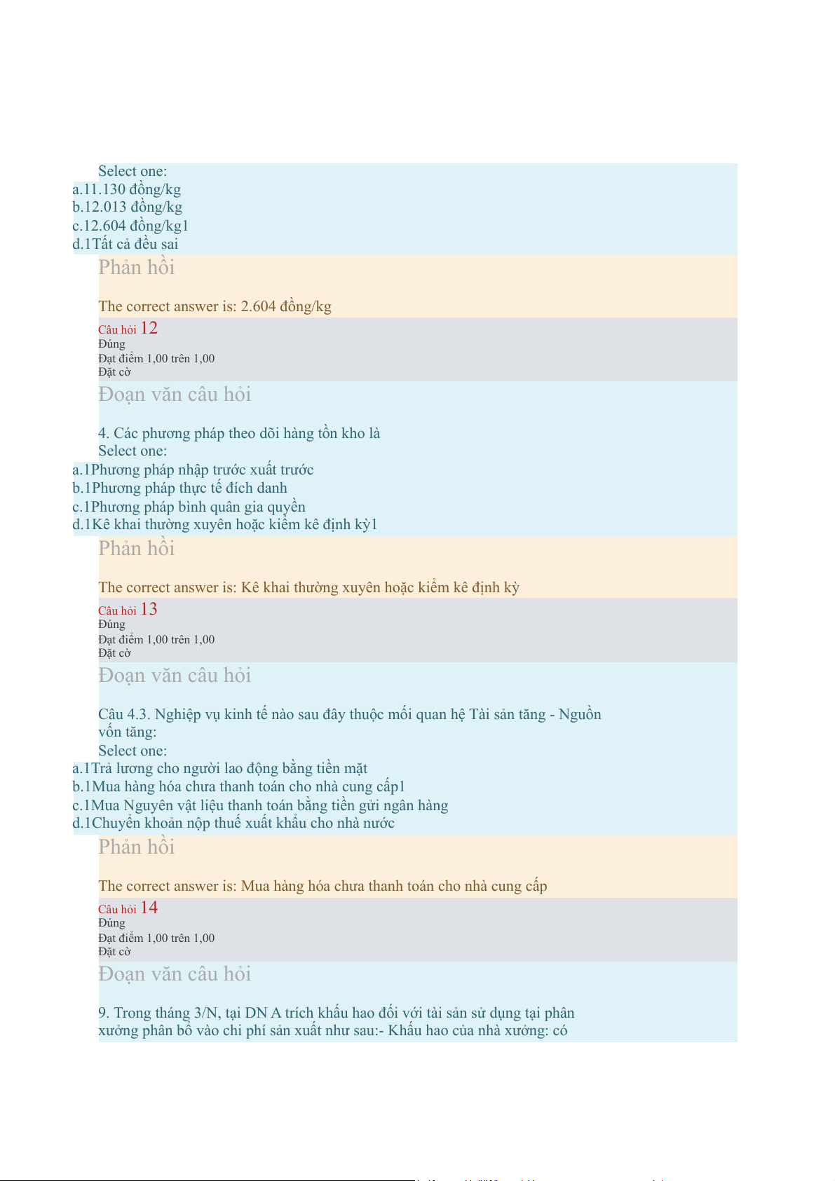 The correct answer is: 2.604 đồng/kg Câu hỏi 12 Đúng Đạt điểm 1,00 trên 1,00 Đặt cờ Đoạn văn câu hỏi
