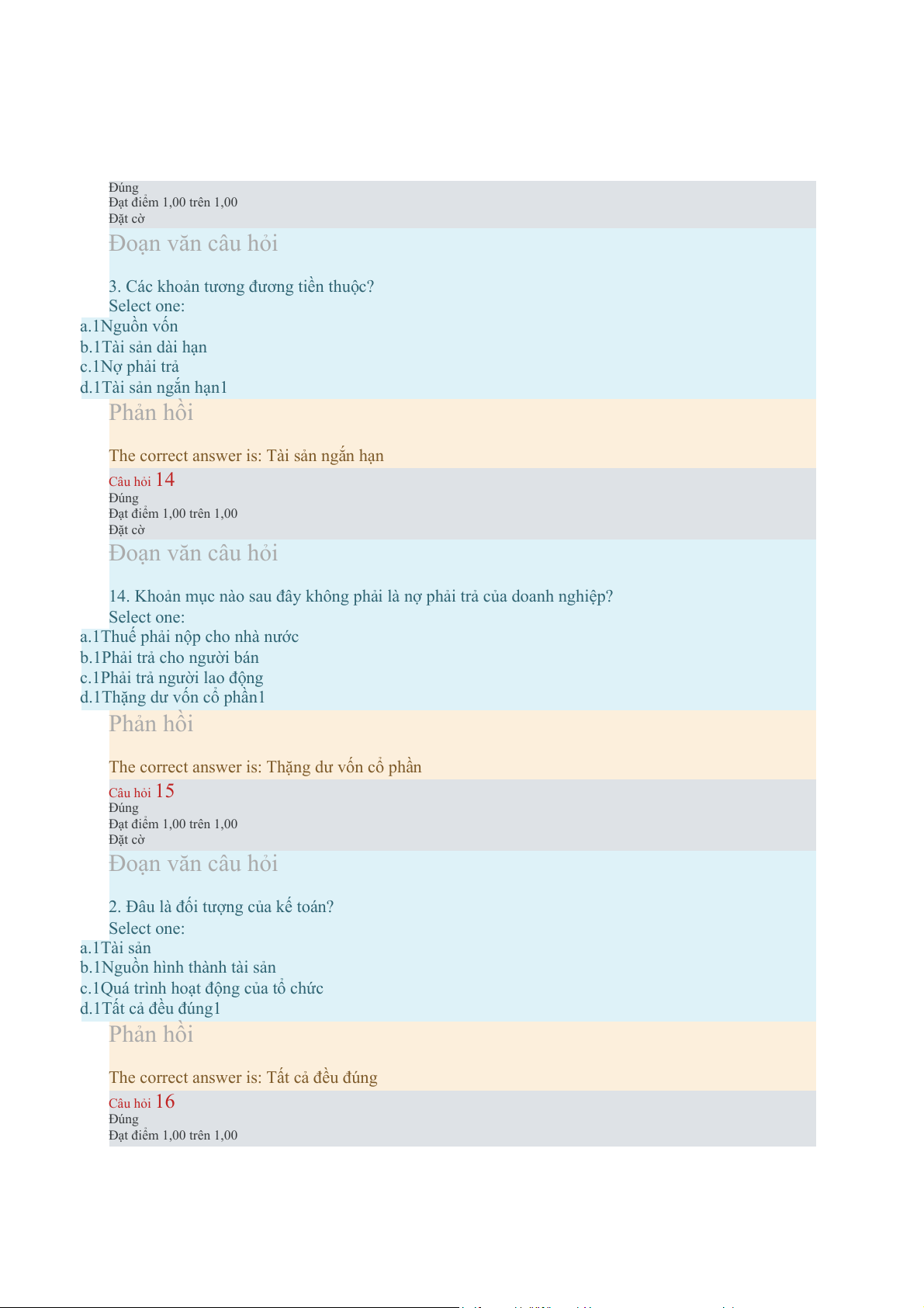 The correct answer is: Tài sản ngắn hạn Câu hỏi 14 Đúng Đạt điểm 1,00 trên 1,00 Đặt cờ Đoạn văn câu hỏi
