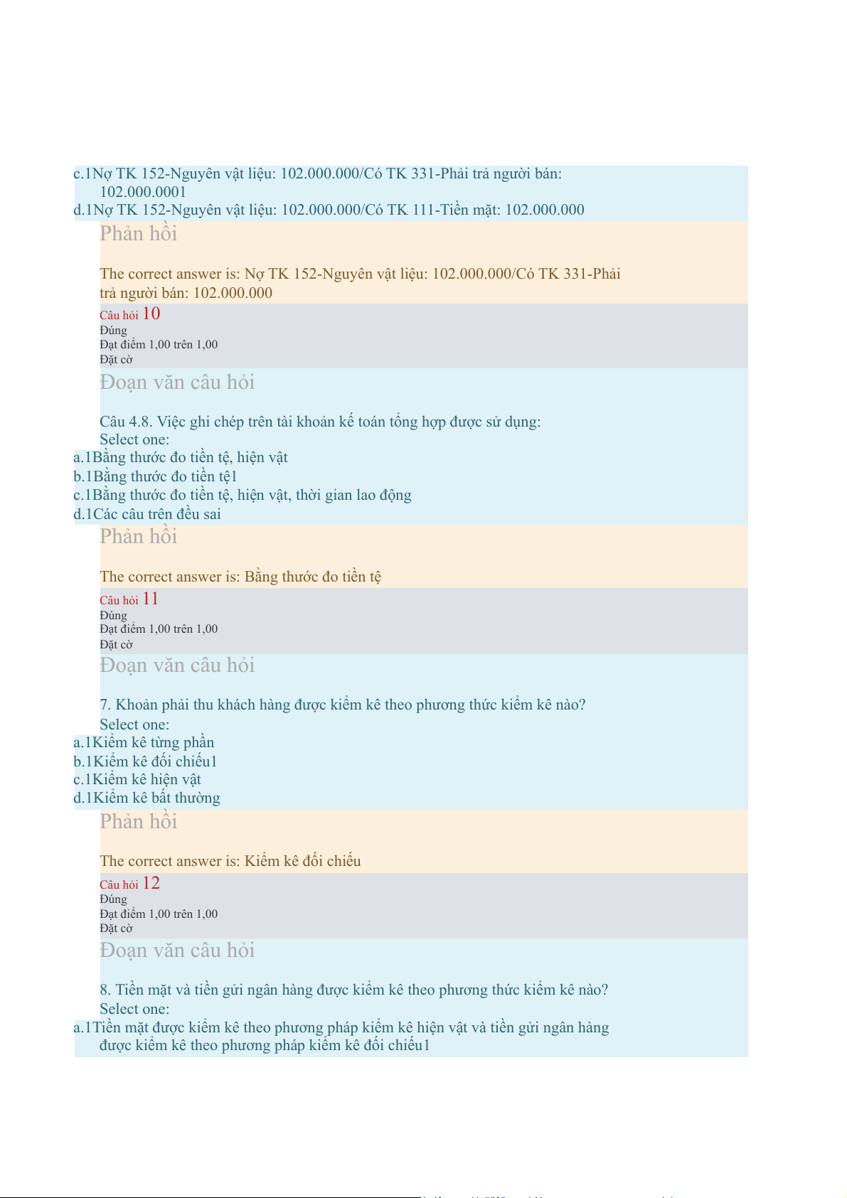 The correct answer is: Không có số dư Câu hỏi 10 Đúng Đạt điểm 1,00 trên 1,00 Đặt cờ Đoạn văn câu hỏi
