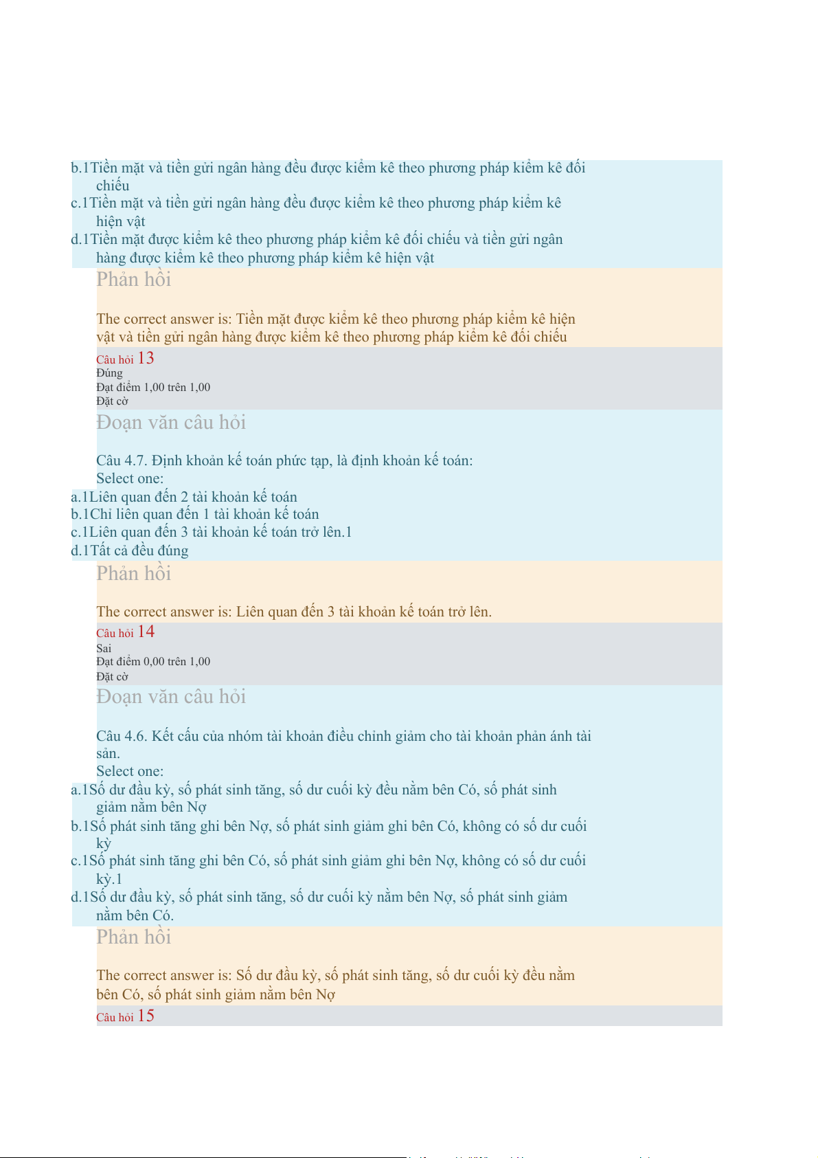 The correct answer is: Kê khai thường xuyên hoặc kiểm kê định kỳ Câu hỏi 13 Đúng Đạt điểm 1,00 trên 1,00 Đặt cờ Đoạn văn câu hỏi