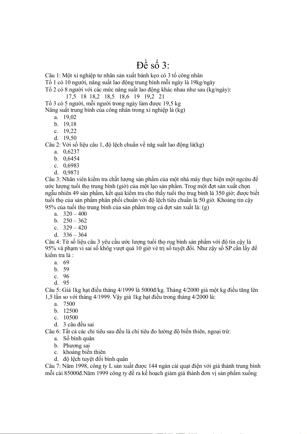 Câu 20: Với số liệu câu 19, tính chung cho cả 3 SP, giá thành tăng (%) a. 12,63 b. 2,63 c. 5,02 d. 6,23