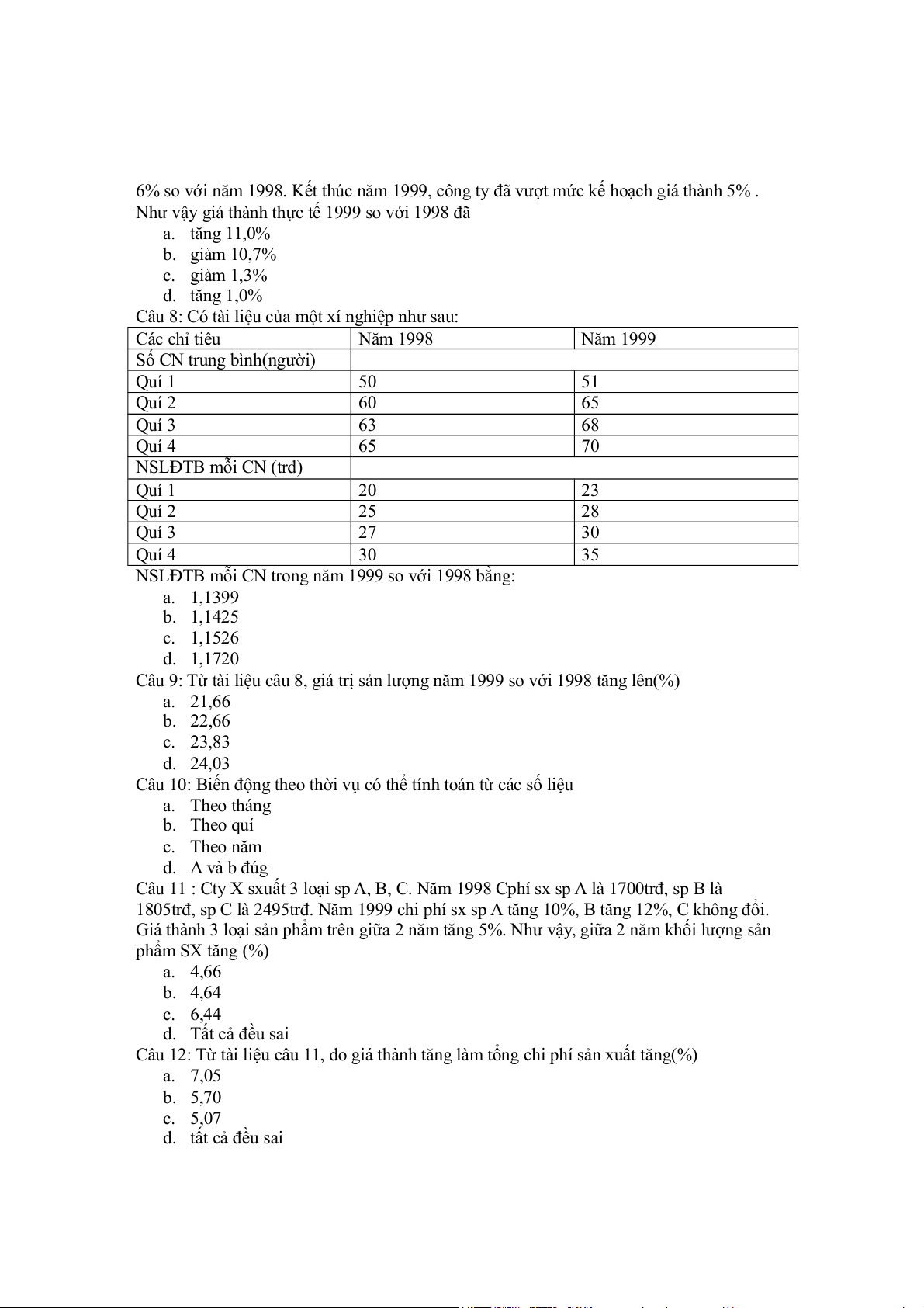 Câu 8: Có tài liệu của một xí nghiệp như sau: Các chỉ tiêu Năm 1998 Năm 1999 Số CN trung bình(người) Quí 1 50 51 Quí 2 60 65 Quí 3 63 68 Quí 4 65 70 NSLĐTB mỗi CN (trđ) Quí 1 20 23 Quí 2 25 28 Quí 3 27 30 Quí 4 30 35