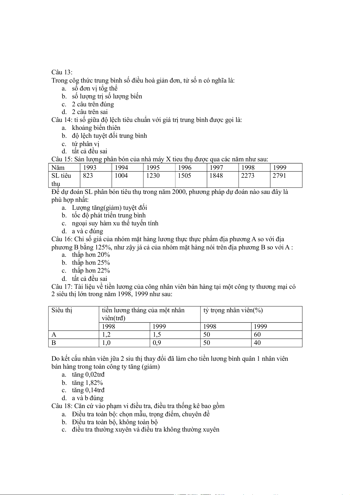 Câu 17: Tài liệu về tiền lương của công nhân viên bán hàng tại một công ty thương mại có