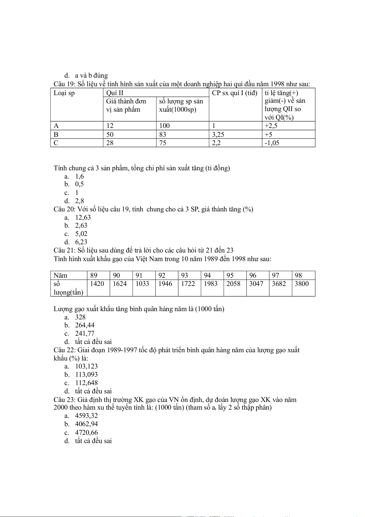 Câu 22: Giai đoạn 1989-1997 tốc độ phát triển bình quân hàng năm của lượng gạo xuất khẩu (%) là: a. 103,123 b. 113,093 c. 112,648 d. tất cả đều sai