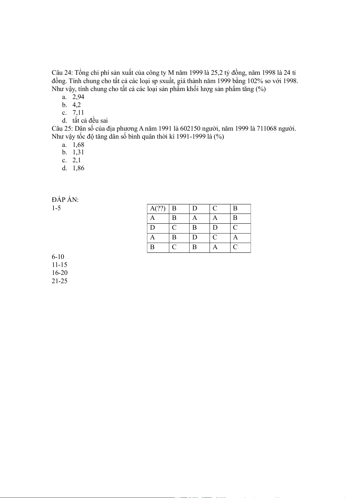 Như vậy tốc độ tăng dân số bình quân thời kì 1991-1999 là (%) a. 1,68 b. 1,31 c. 2,1 d. 1,86 ĐÁP ÁN: 1-5 A(??) B D C B A B A A B D C B D C A B D C A B C B A C 6-10 11-15 16-20 21-25