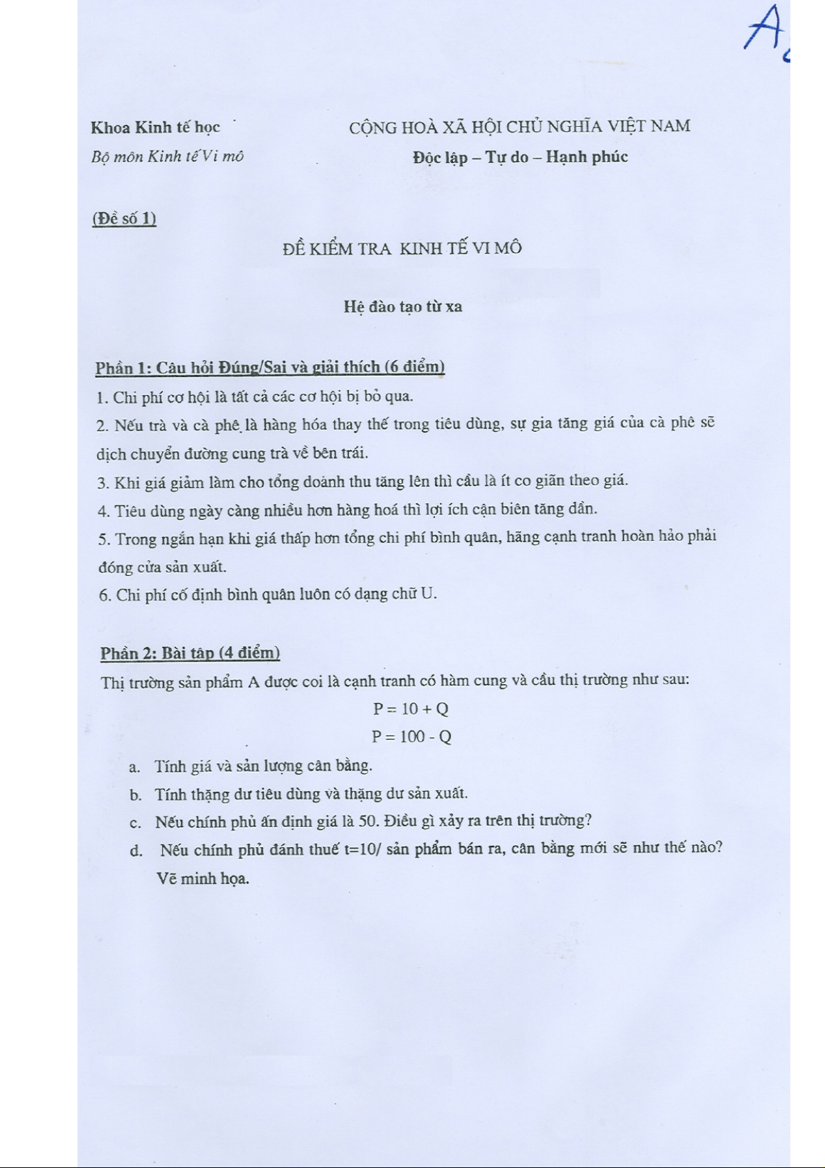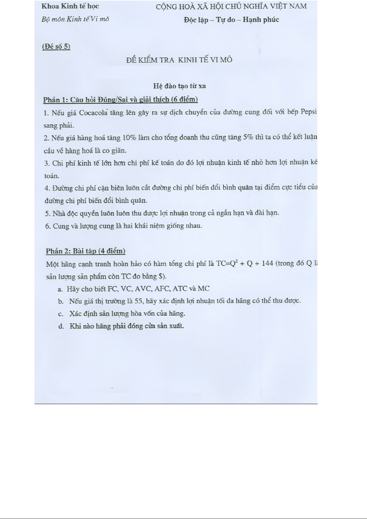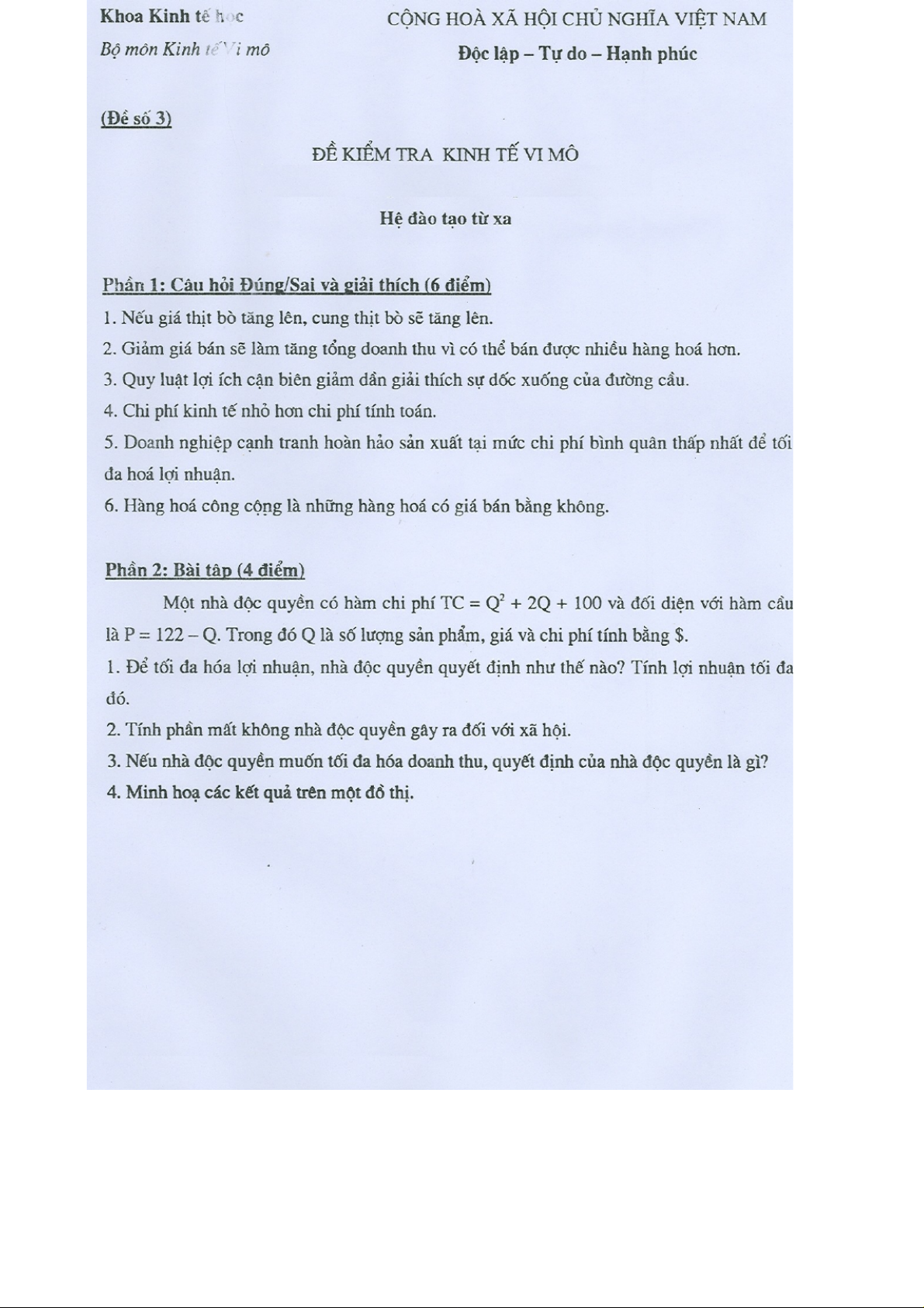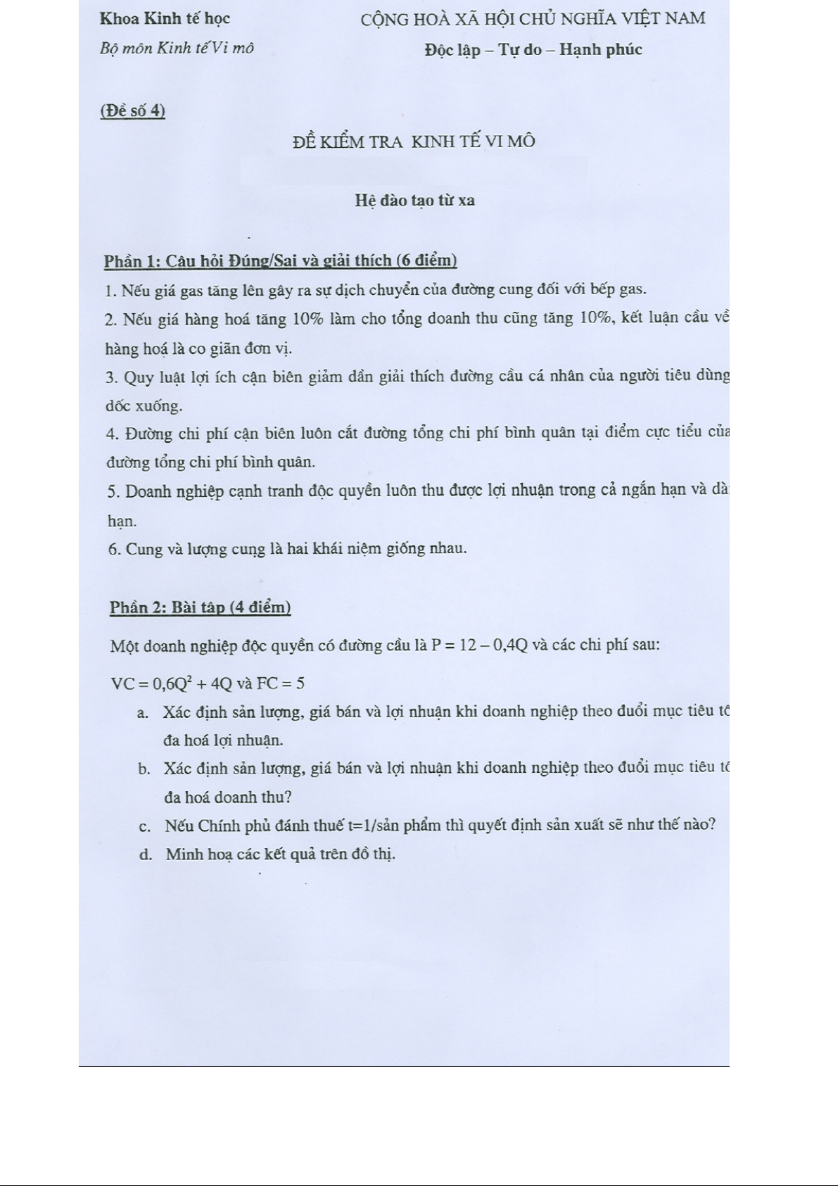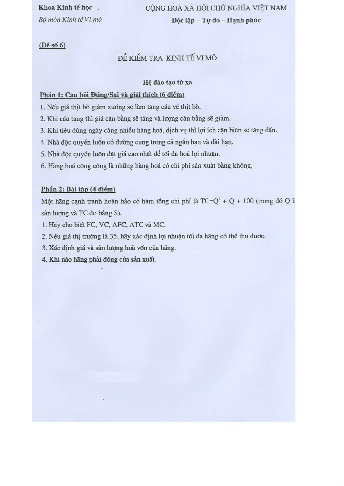 Đề thi tự luận hệ đào tạo từ xa | Microeconomics | Trường Đại học Quốc tế, Đại học Quốc gia Thành phố Hồ Chí Minh
