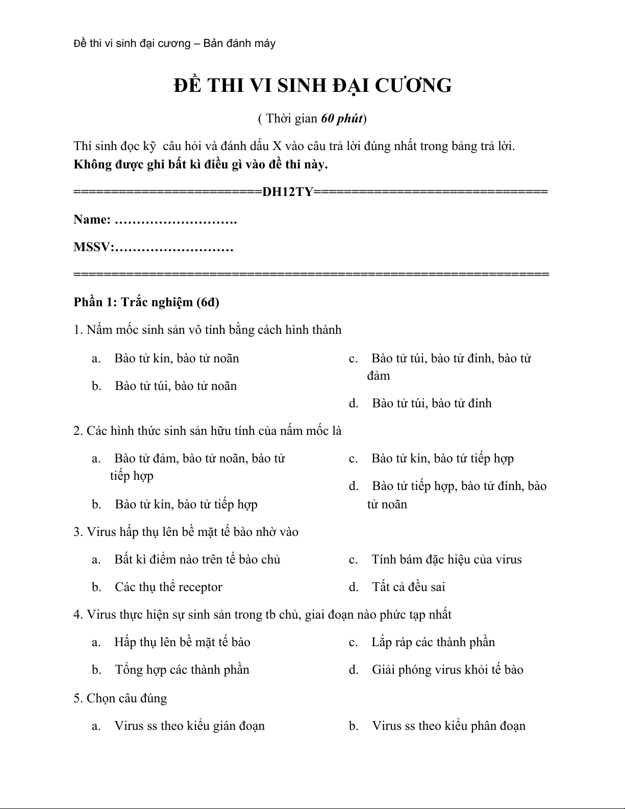 ĐỀ THI VI SINH ĐẠI CƯƠNG